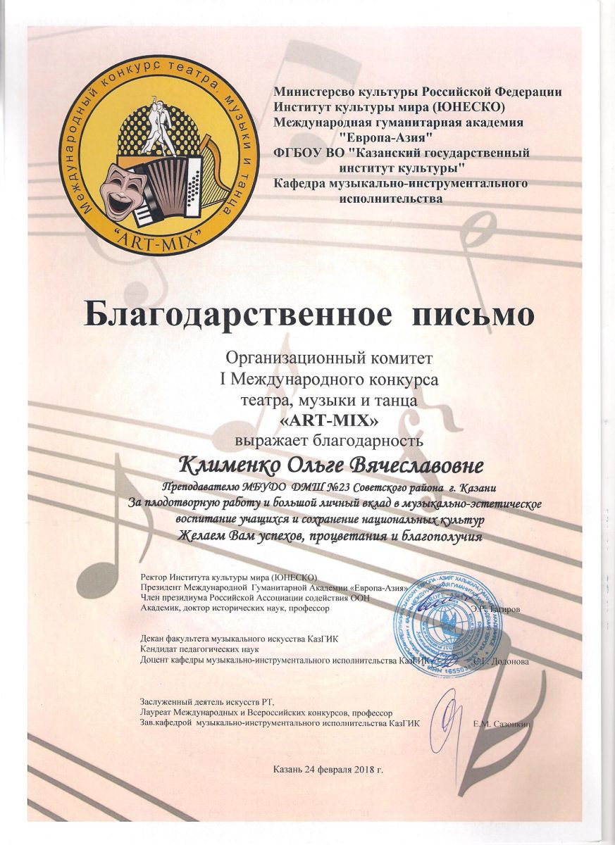 I Международный конкурс театра, музыки и танца "ART-MIX" - Благодарственное письмо - Клименко О.В.