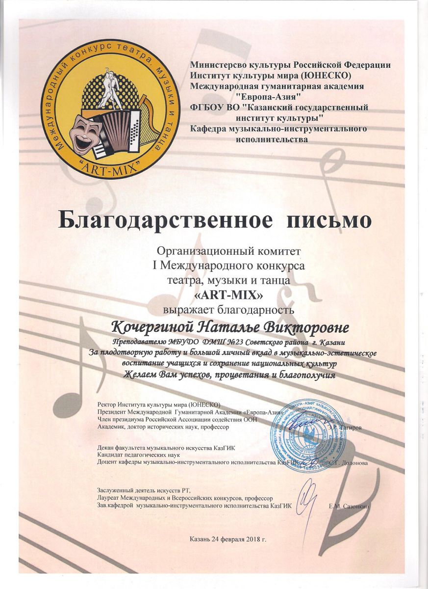 I Международный конкурс театра, музыки и танца "ART-MIX" - Благодарственное письмо - Кочергина Н.В.