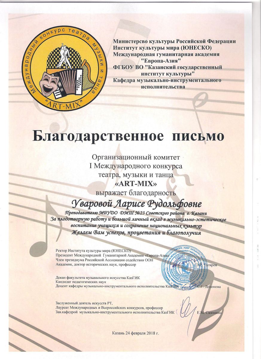 I Международный конкурс театра, музыки и танца "ART-MIX" - Благодарственное письмо - Уварова Л.Р.