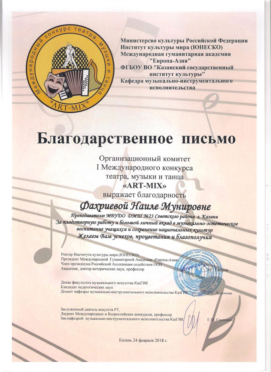 I Международный конкурс театра, музыки и танца "ART-MIX" - Благодарственное письмо - Фахриева Н.М.