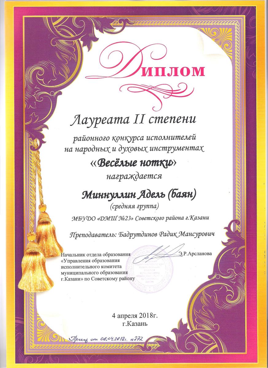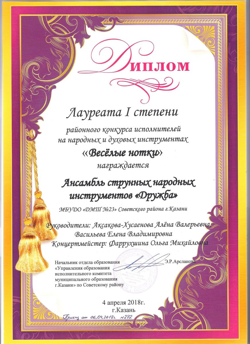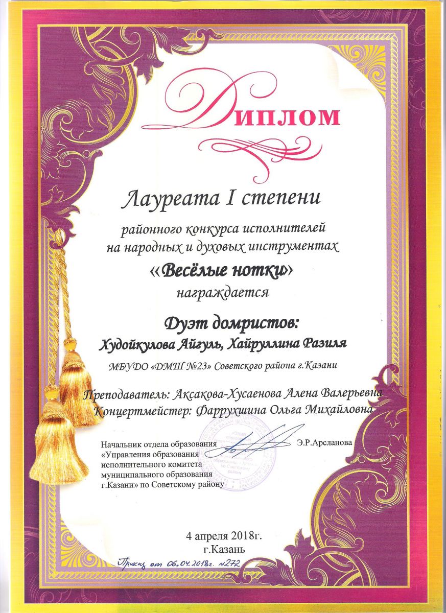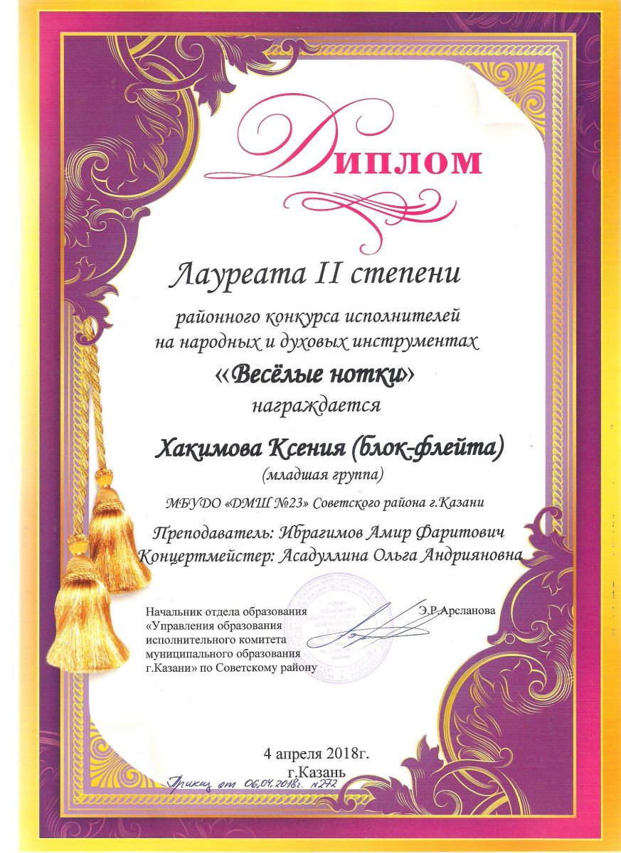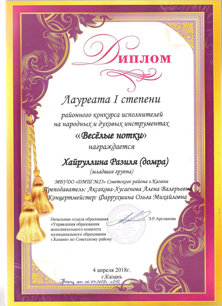 Районный конкурс исполнителей на народных и духовых инструментах "Весёлые нотки" - Диплом дипломанта 1 степени - Сабирзянова Адиля (преподаватель: Петрова М.С., концертмейстер: Петрова М.С.)