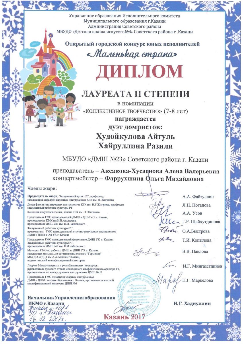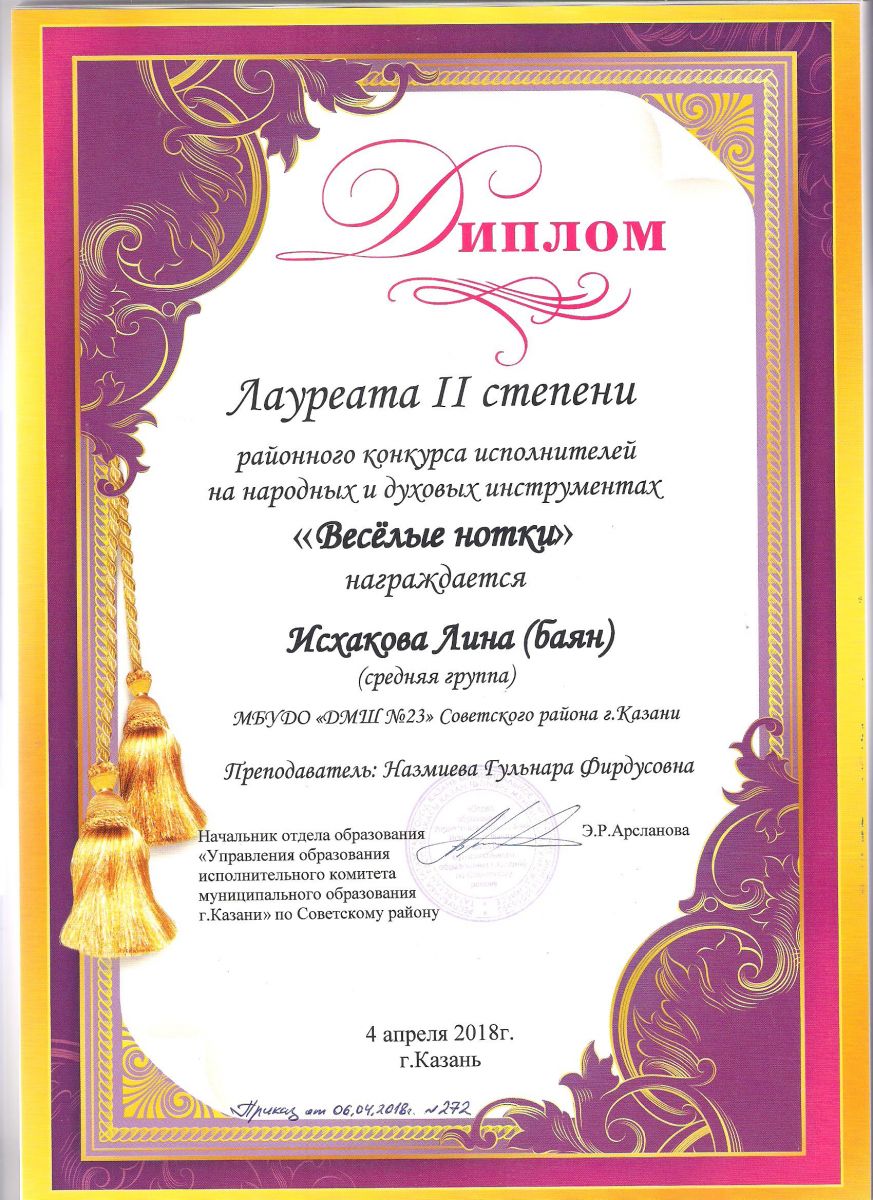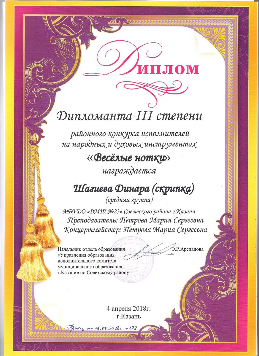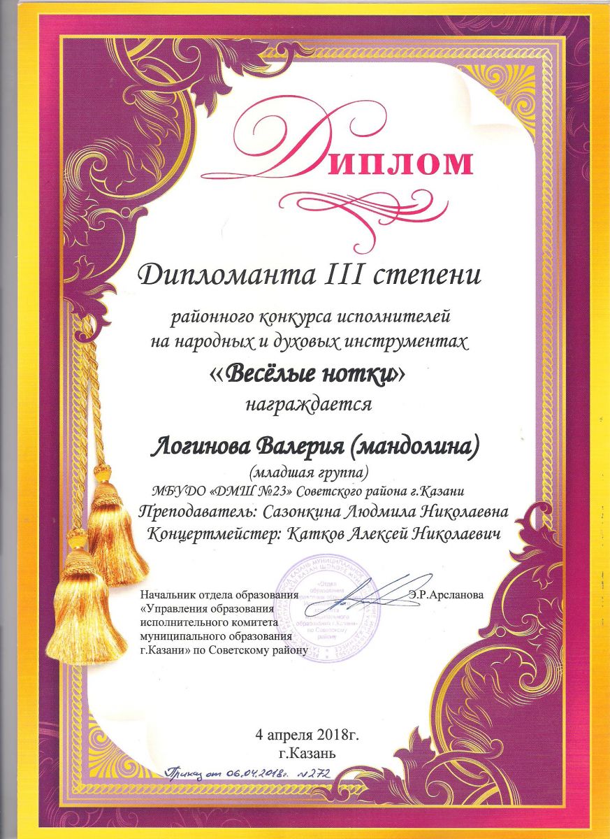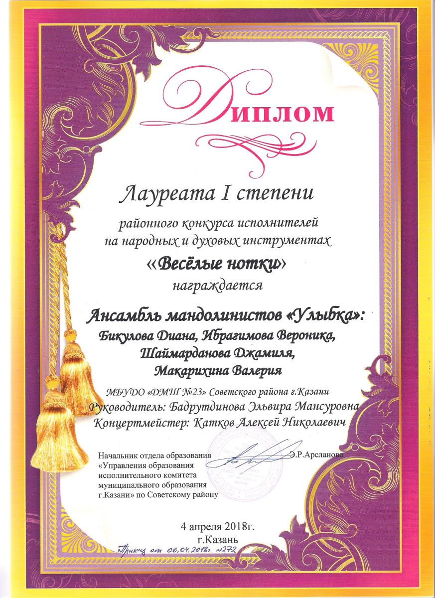 Районный конкурс исполнителей на народных и духовых инструментах "Весёлые нотки" - Диплом дипломанта 1 степени - Сабирзянова Адиля (преподаватель: Петрова М.С., концертмейстер: Петрова М.С.)