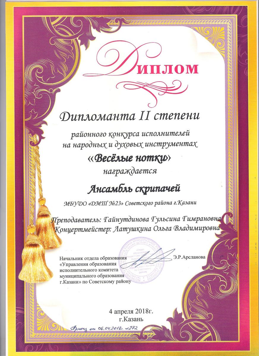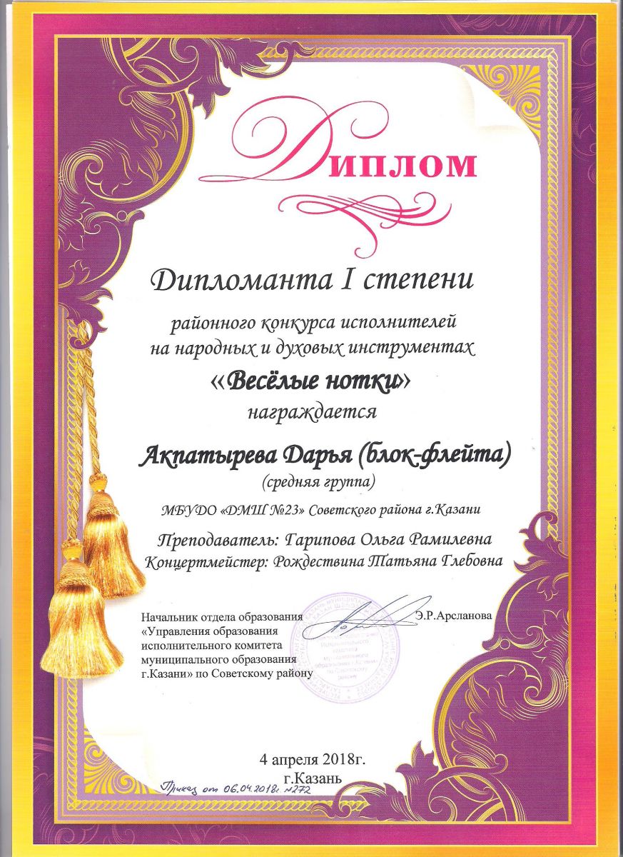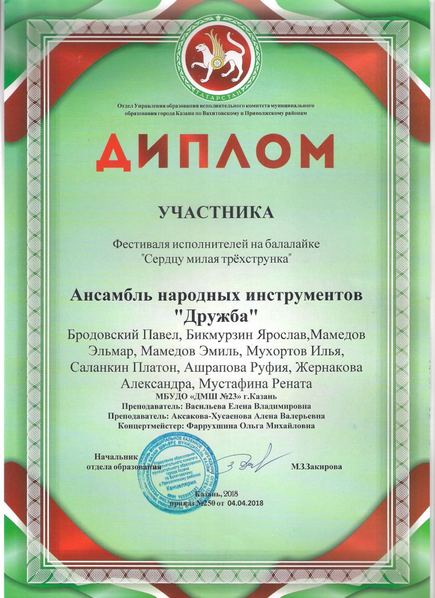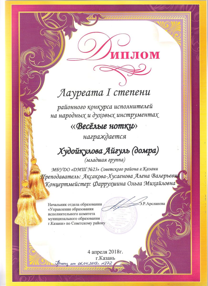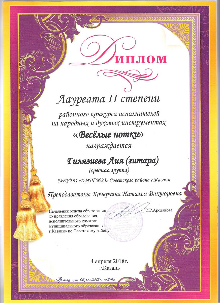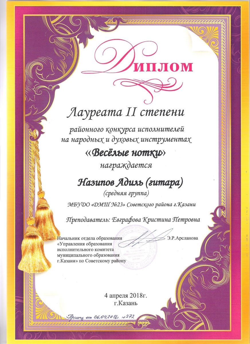 Районный конкурс исполнителей на народных и духовых инструментах "Весёлые нотки" - Диплом дипломанта 1 степени - Сабирзянова Адиля (преподаватель: Петрова М.С., концертмейстер: Петрова М.С.)