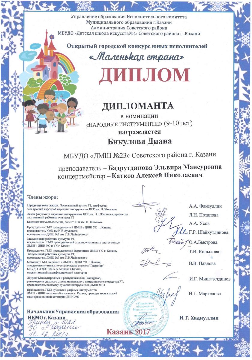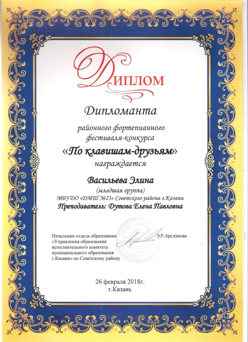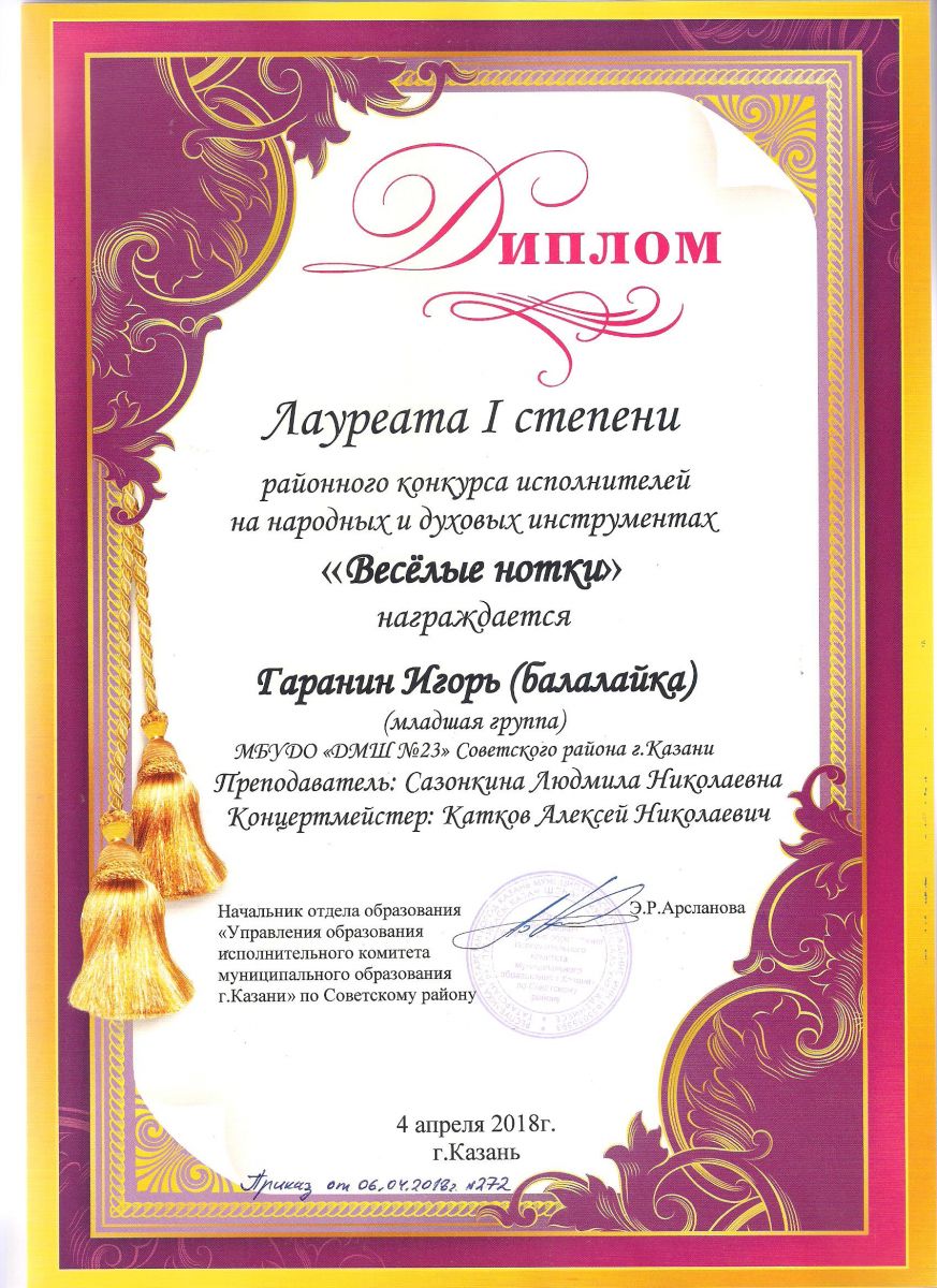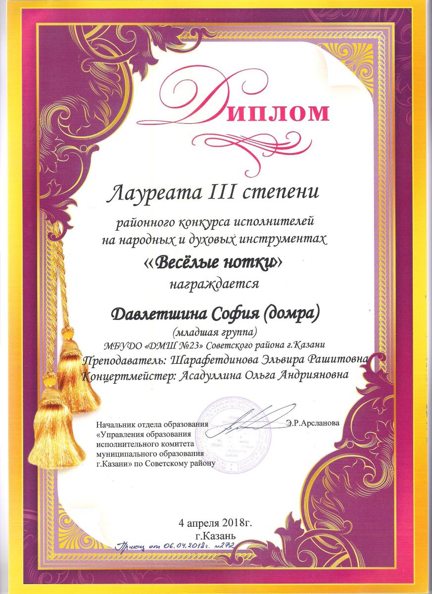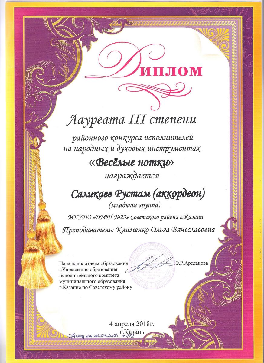 Районный конкурс исполнителей на народных и духовых инструментах "Весёлые нотки" - Диплом дипломанта 1 степени - Сабирзянова Адиля (преподаватель: Петрова М.С., концертмейстер: Петрова М.С.)