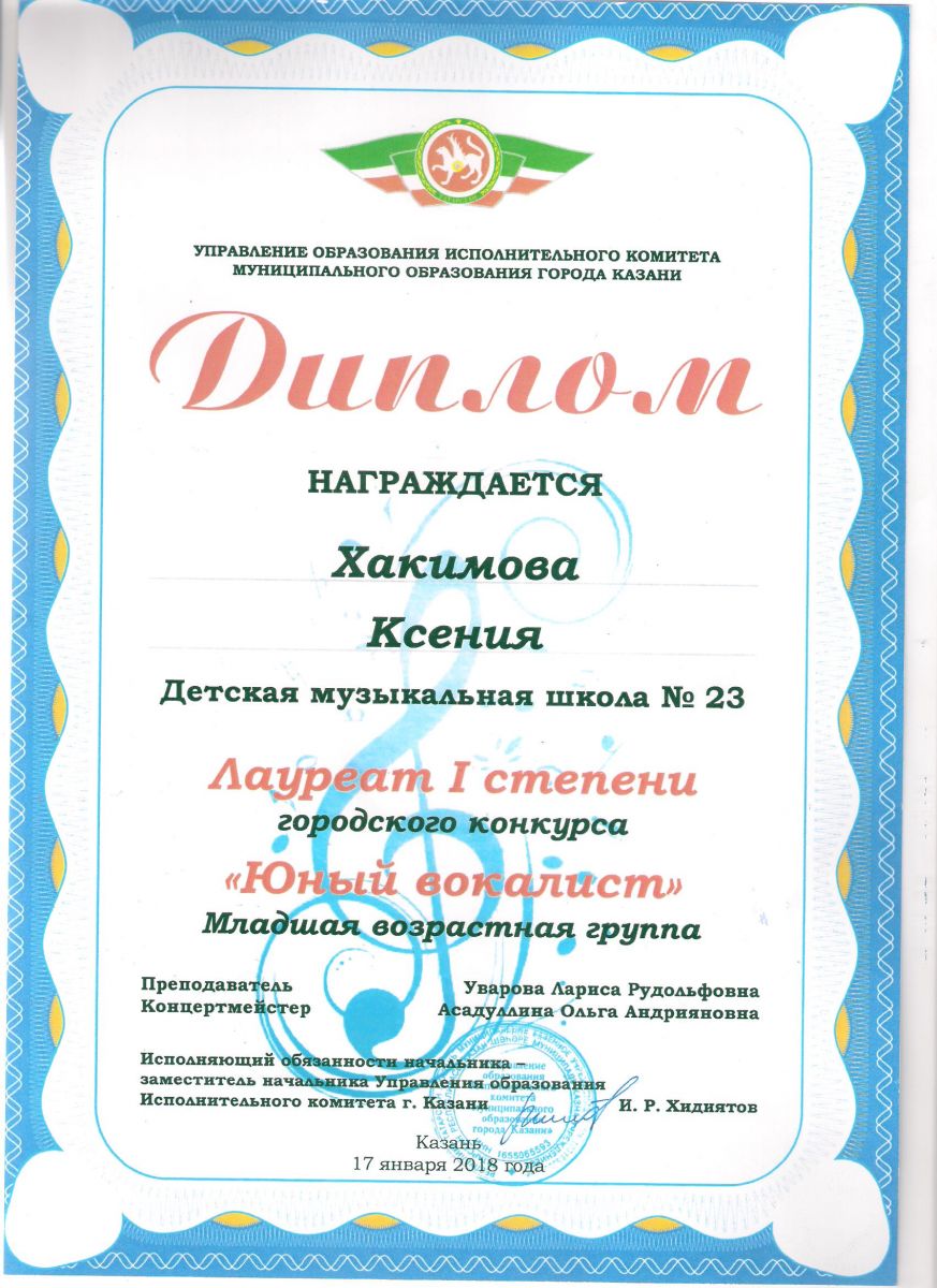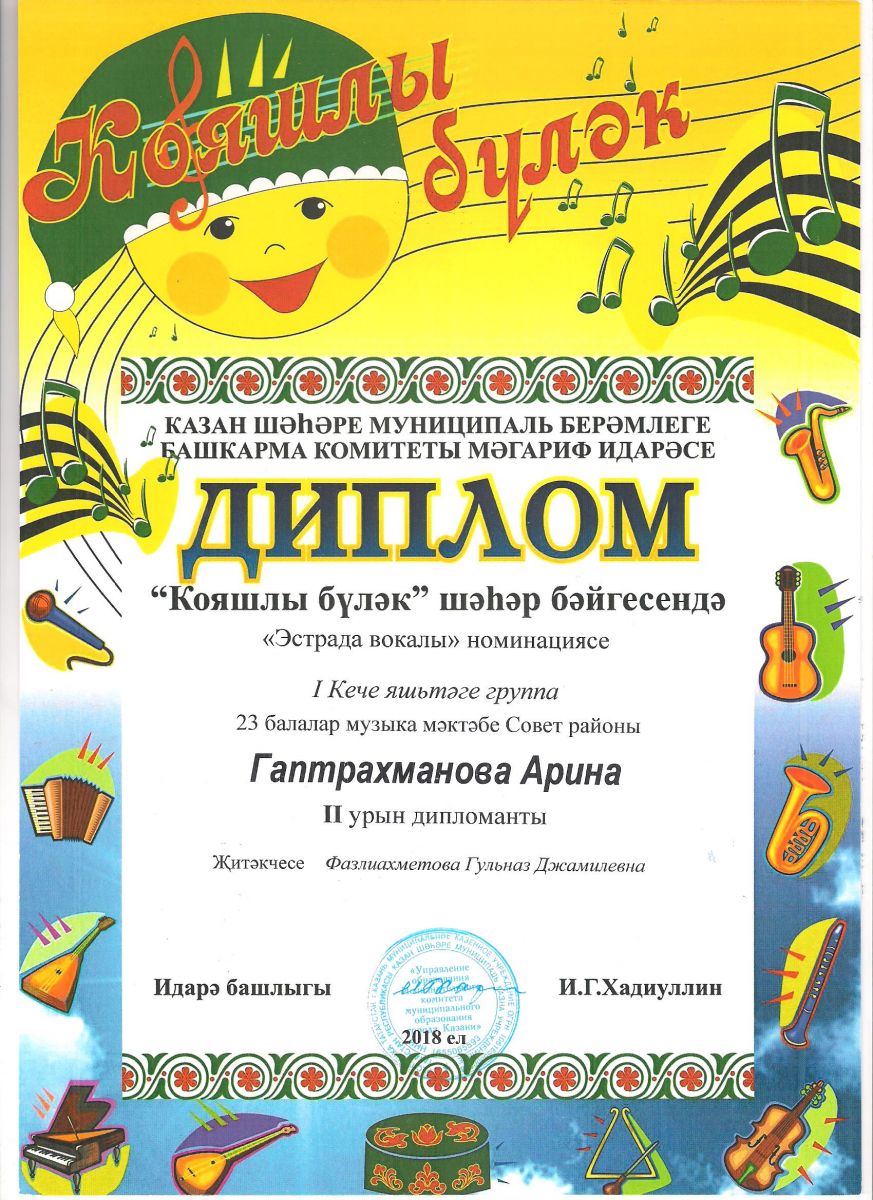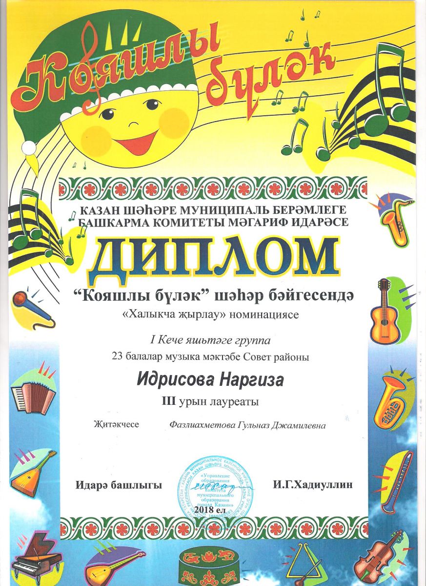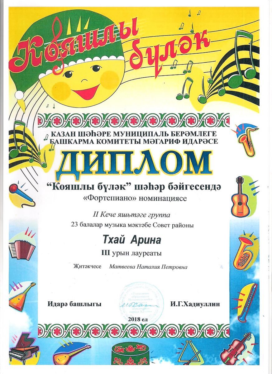 Городской конкурс татарской музыки "Кояшлы булэк" - Диплом лауреата 3 степени - Тхай Арина (преподаватель: Матвеева Н.П.)