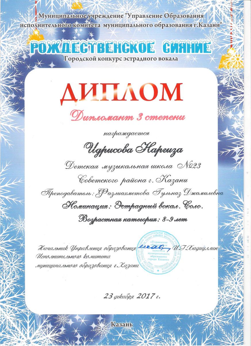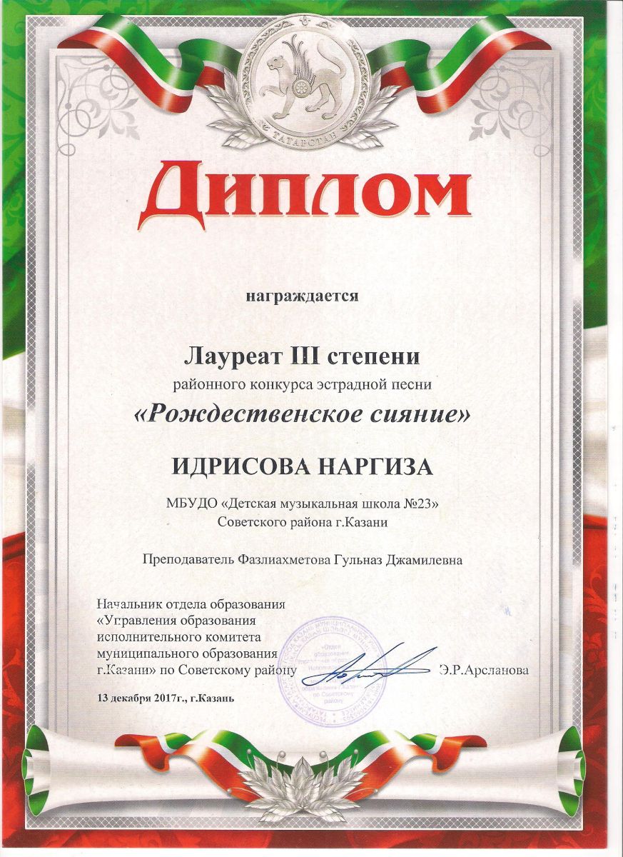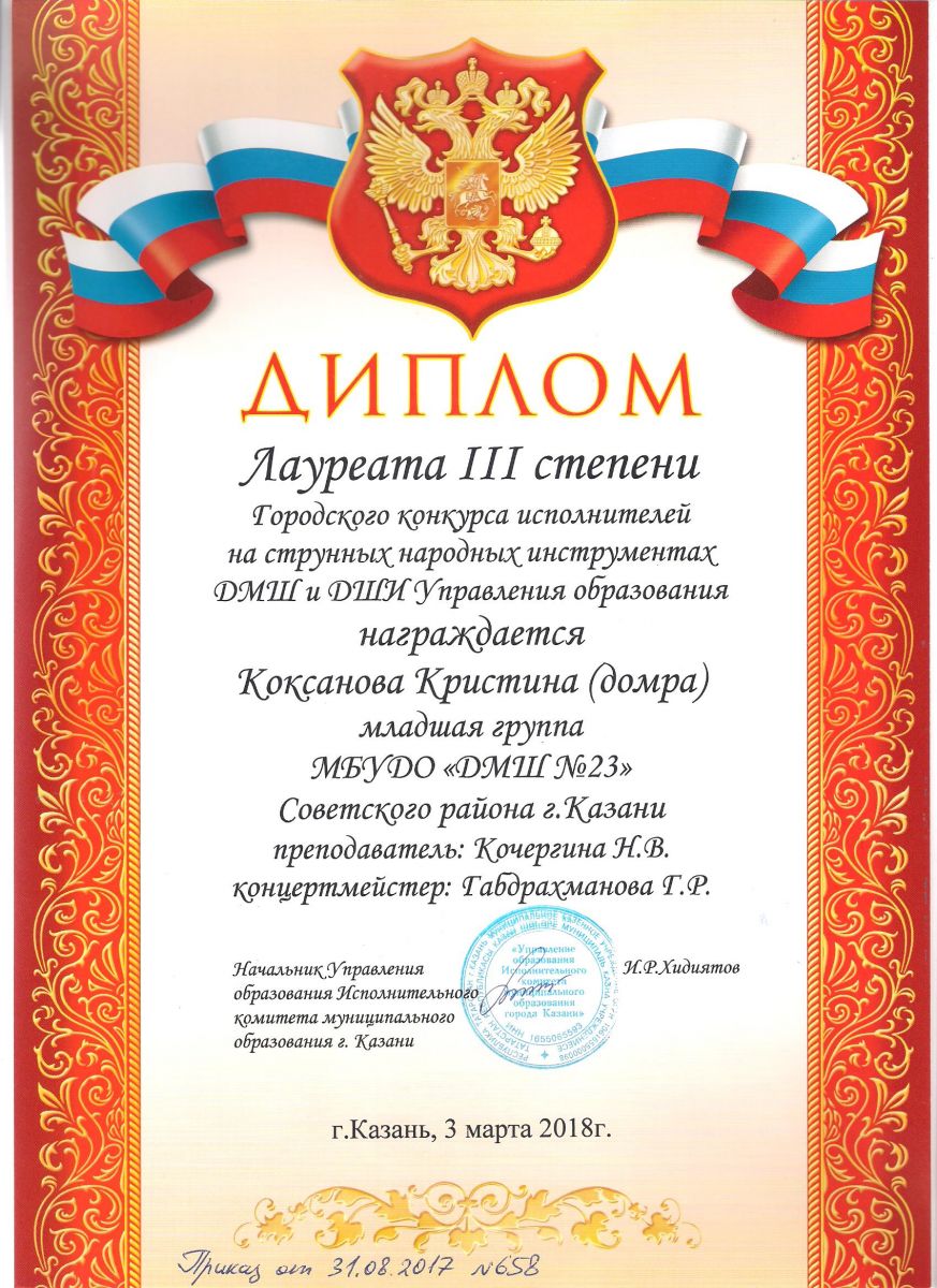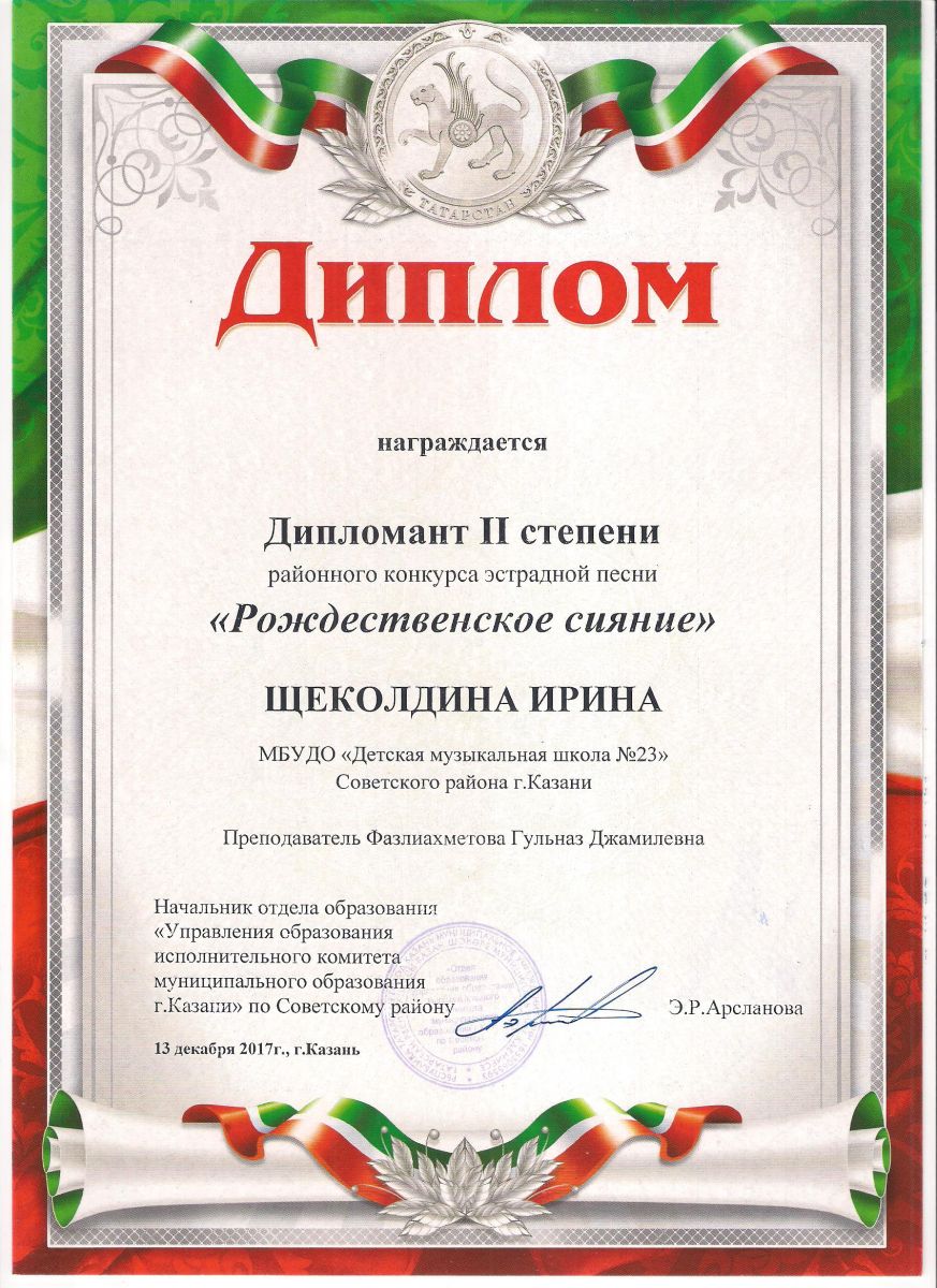 Городской конкурс татарской музыки "Кояшлы булэк" - Диплом лауреата 3 степени - Тхай Арина (преподаватель: Матвеева Н.П.)