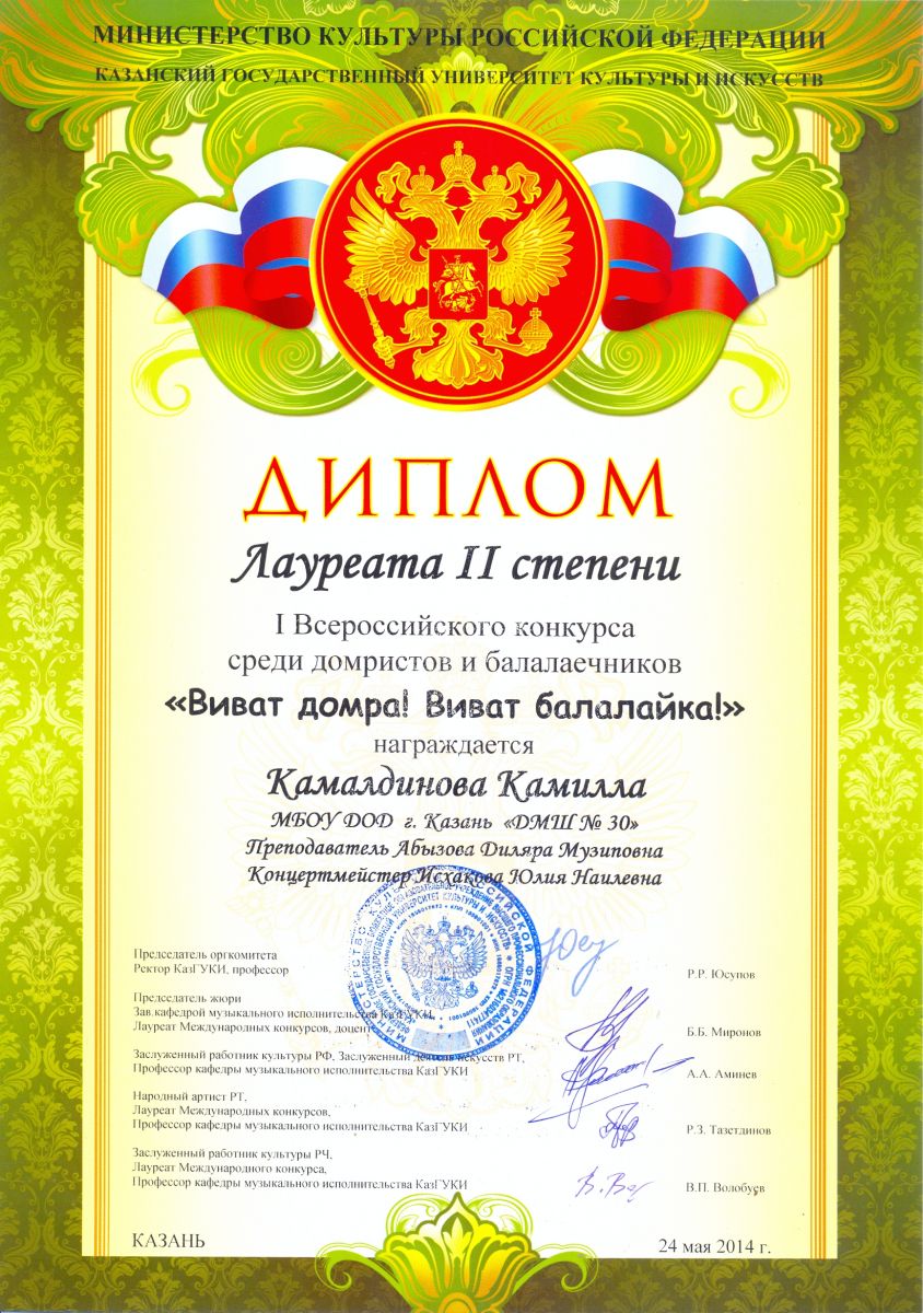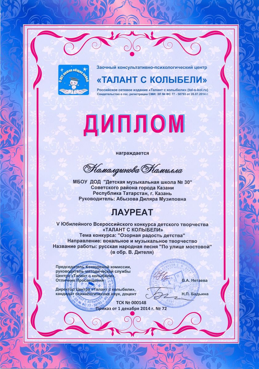 Всероссийский конкурс детского творчества «Талант с колыбели» - Камалдинова Камилла- лауреат
