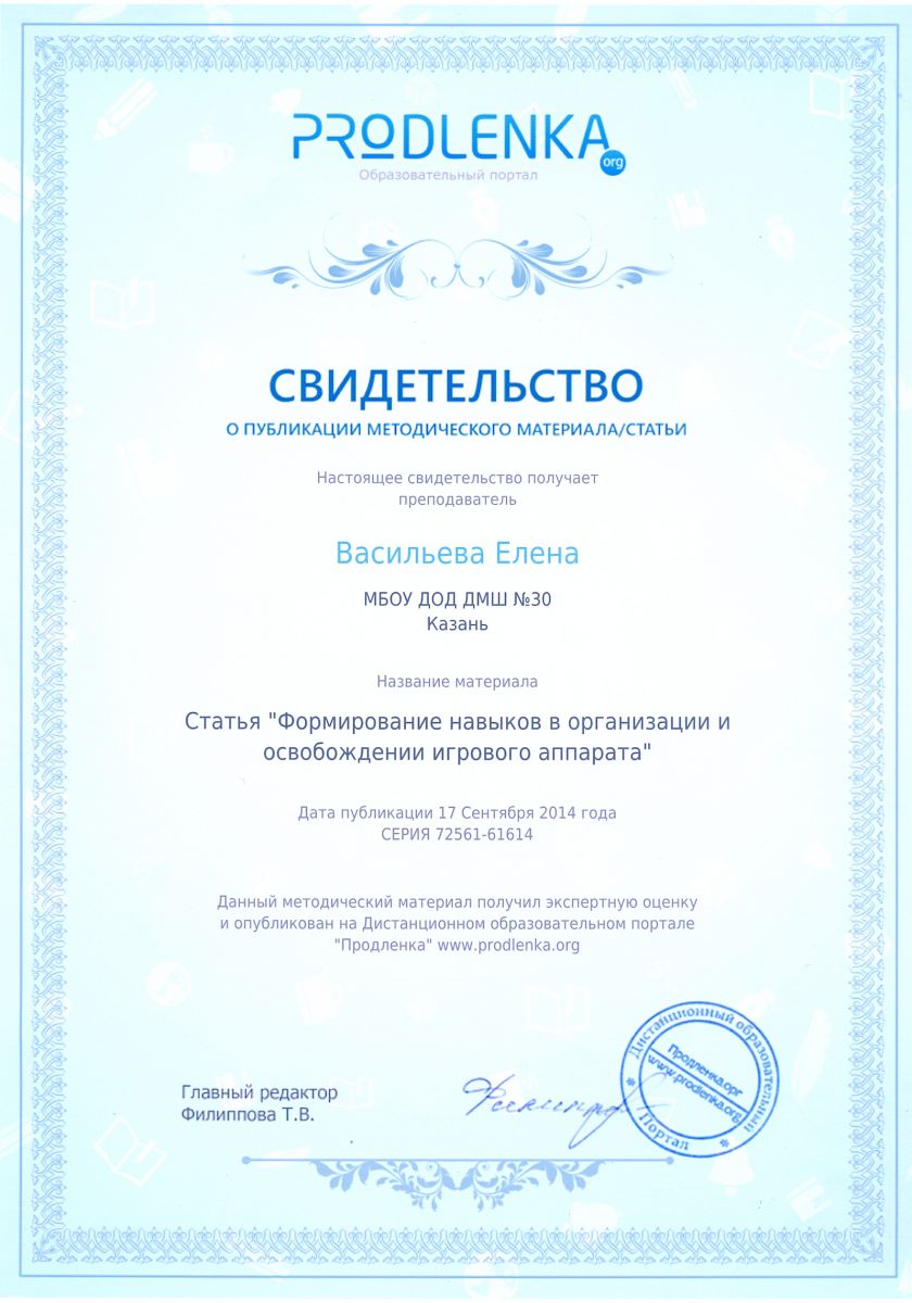 Статья «Формирование навыков в организации и освобождении игрового аппарата» на Дистанционном образовательном портале «Продленка» www/prpdlenka.org, автор – Васильева Е.В.