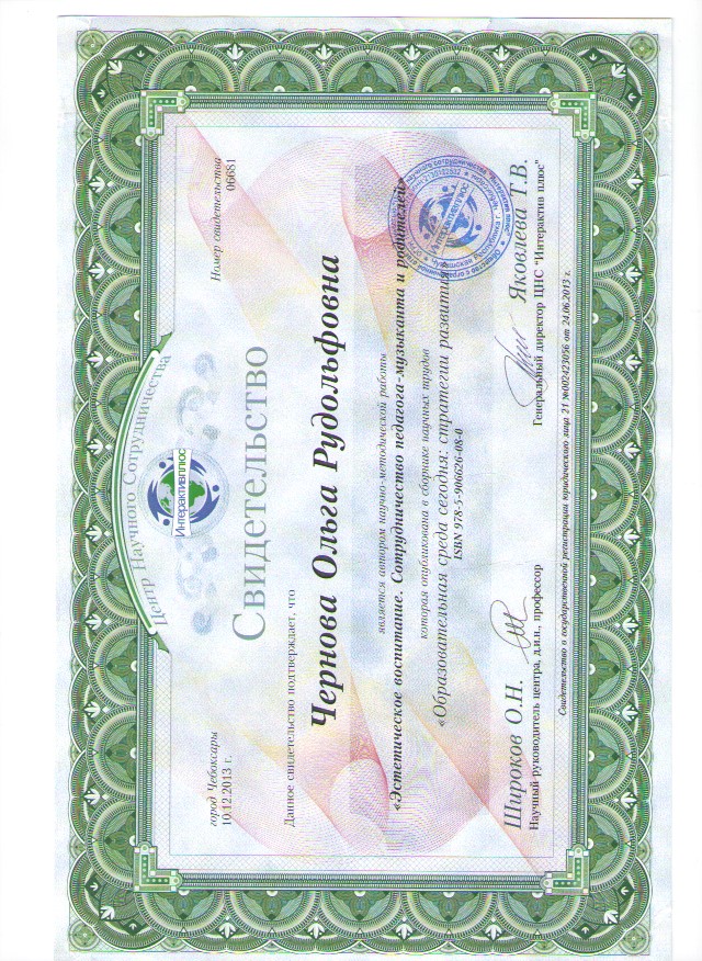 Статья «Эстетическое воспитание. Сотрудничество педагога – музыканта и родителей» в сборнике статей по материалам работы Международной научно-практической интернет-конференции «Образовательная среда сегодня: стратегии развития», автор – Чернова О.Р.