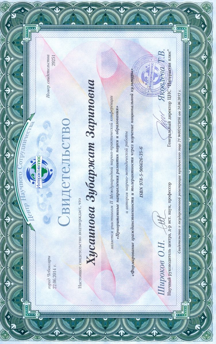Статья «Формирование гражданственности и толерантности через изучение национальной культуры » в сборнике статей по материалам работы II Международной научно-практической интернет-конференции «Приоритетные направления развития науки и образования », автор – Хусаинова З.З.