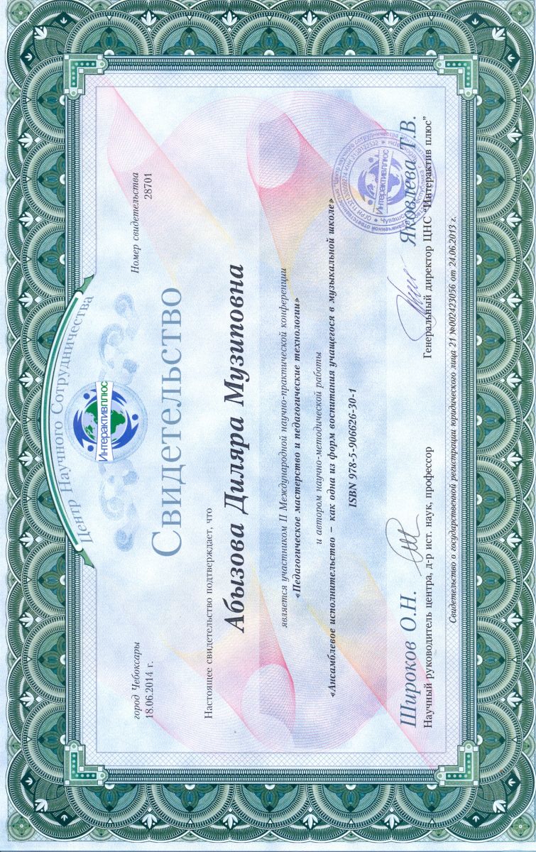 Статья «Ансамблевое исполнительство – как одна из форм воспитания учащегося в музыкальной школе» в сборнике статей по материалам работы II Международной научно-практической интернет-конференции «Педагогическое мастерство и педагогические технологии», автор – Абызова Д.М.