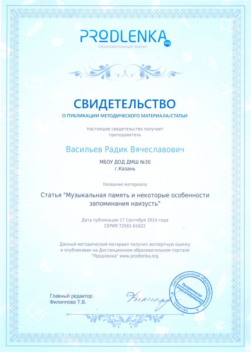 Статья «Музыкальная память и некоторые особенности запоминания наизусть» на Дистанционном образовательном портале «Продленка» www/prpdlenka.org, автор – Васильев Р.В.