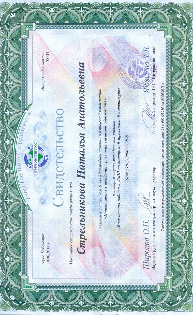 Статья «Внеклассная работа в ДМШ по татарской музыкальной литературе» в сборнике статей по материалам работы II Международной научно-практической интернет-конференции «Инновационный тенденции развития системы образования», автор – Стрельникова Н.А.