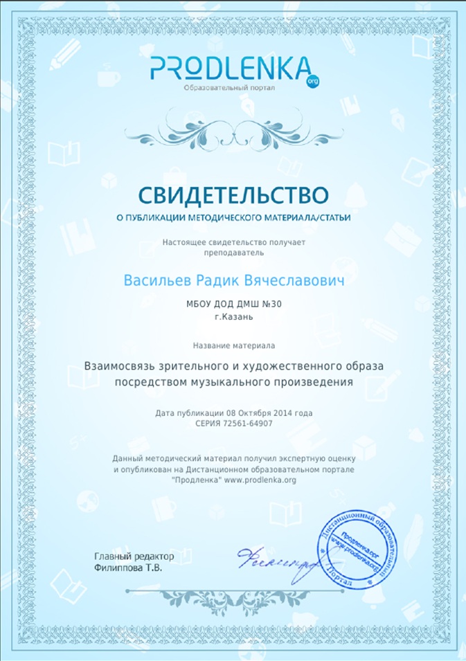 Статья «Взаимосвязь зрительного и художественного образа посредством музыкального произведения» на Дистанционном образовательном портале «Продленка» www/prpdlenka.org, автор – Васильев Р.В.