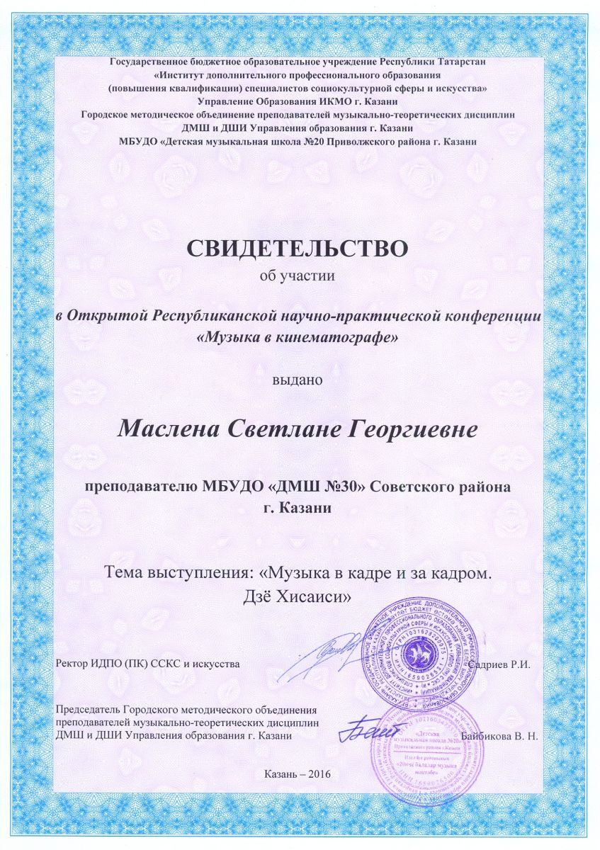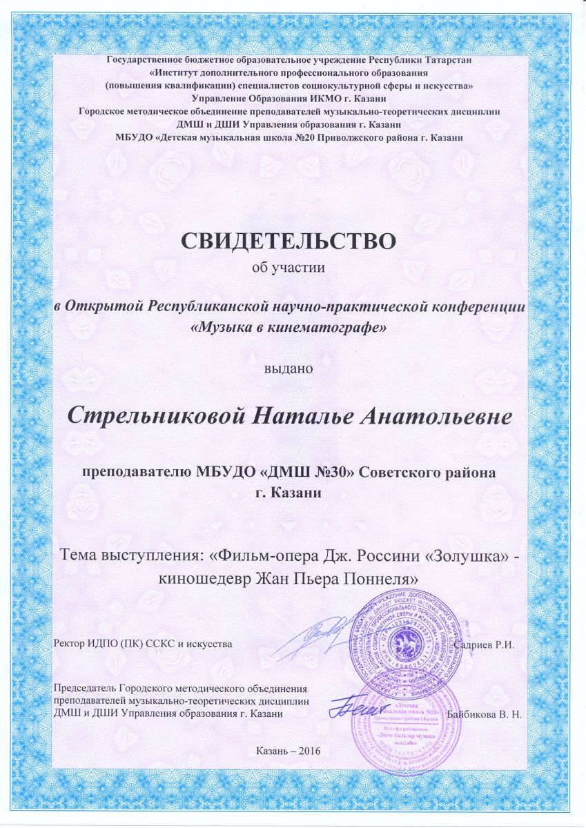 III Республиканская научно-практическая конференция с международным участием "Жигановкие чтения-2016"- доклад "Взаимодействие ДМШ № 30 с профессиональными выставочно-музейными учреждениями (в рамках реализации программы "Внеклассная работа в ДМШ по татарской музыкальной литературе")" - Стрельникова Н.А.