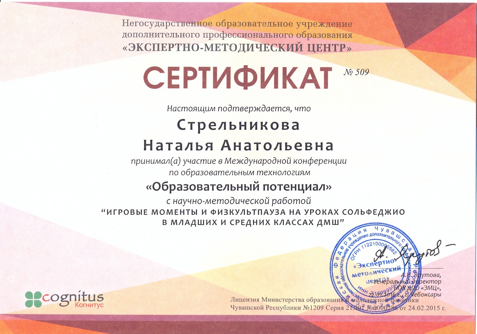 Международная конференция по образовательным технологиям "Образовательный потенциал" - научно-методическая работа "Игровые моменты и физкультпауза на уроках сольфеджио в младших и средних классах ДМШ" - Стрельникова Н.А. - сертификат