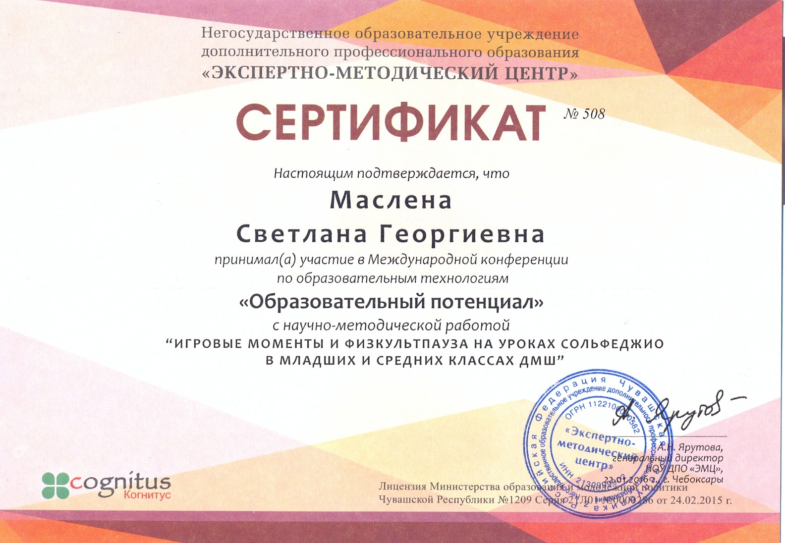 Международная конференция по образовательным технологиям "Образовательный потенциал" - научно-методическая работа "Игровые моменты и физкультпауза на уроках сольфеджио в младших и средних классах ДМШ" - Маслена С.Г. - сертификат
