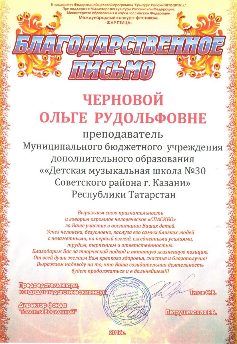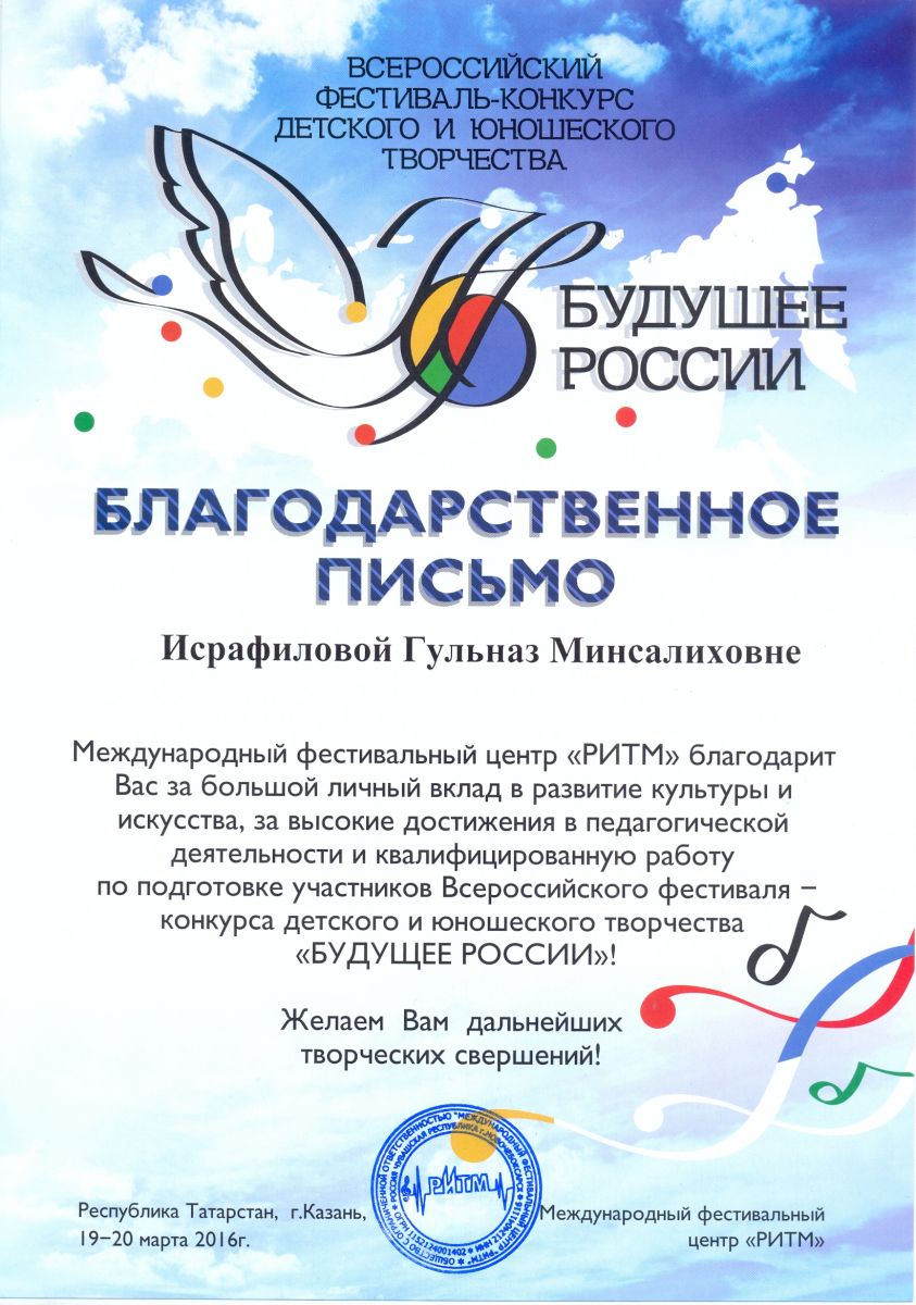 Международный фестиваль-конкурс "Хрустальное сердце мира" - Санукова Н.В. - благодарственное письмо