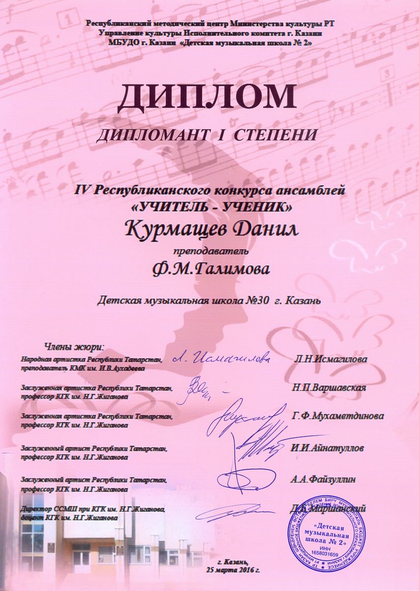 IV Республиканский конкурс ансамблей "Учитель-ученик" - Галиомва Ф.М. - диплом I степени