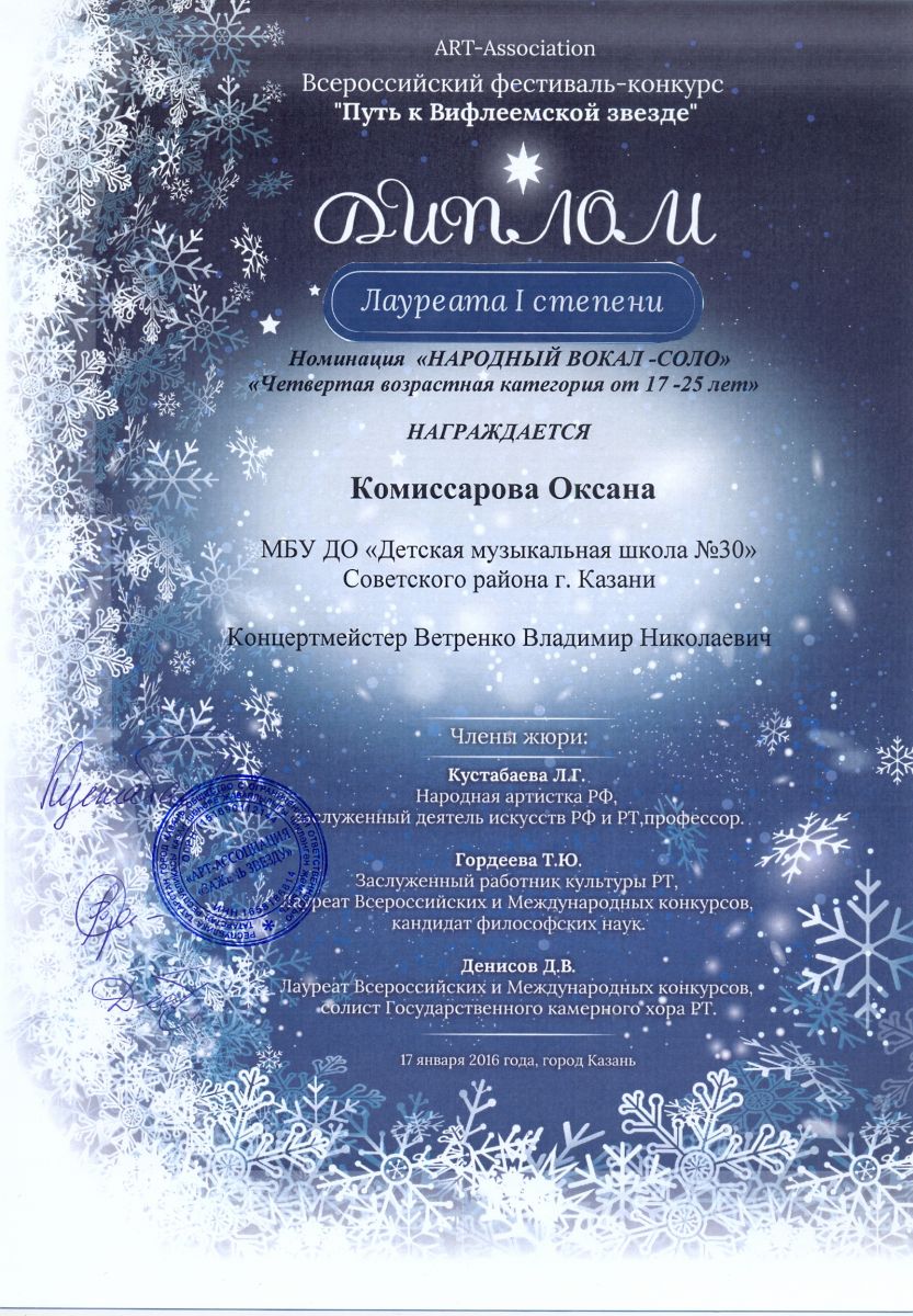 Всероссийский фестиваль-конкурс «Путь к Вифлеемской звезде» - Комиссарова О.М. – I место
