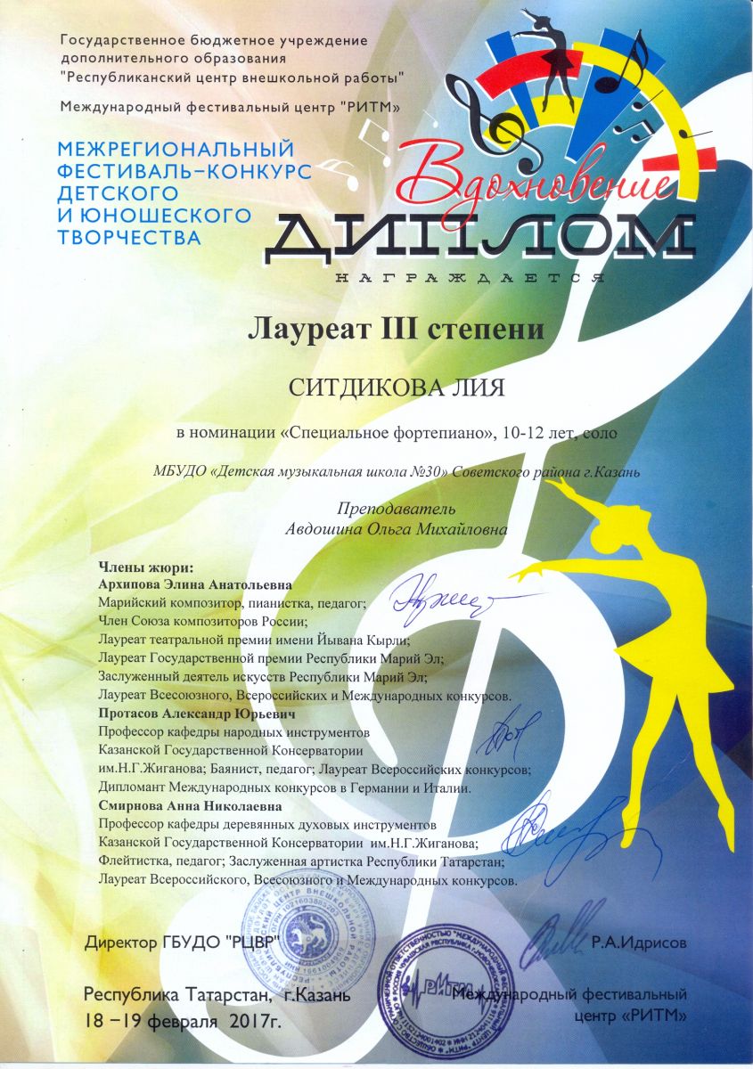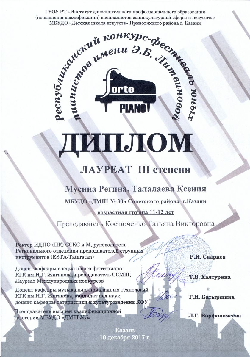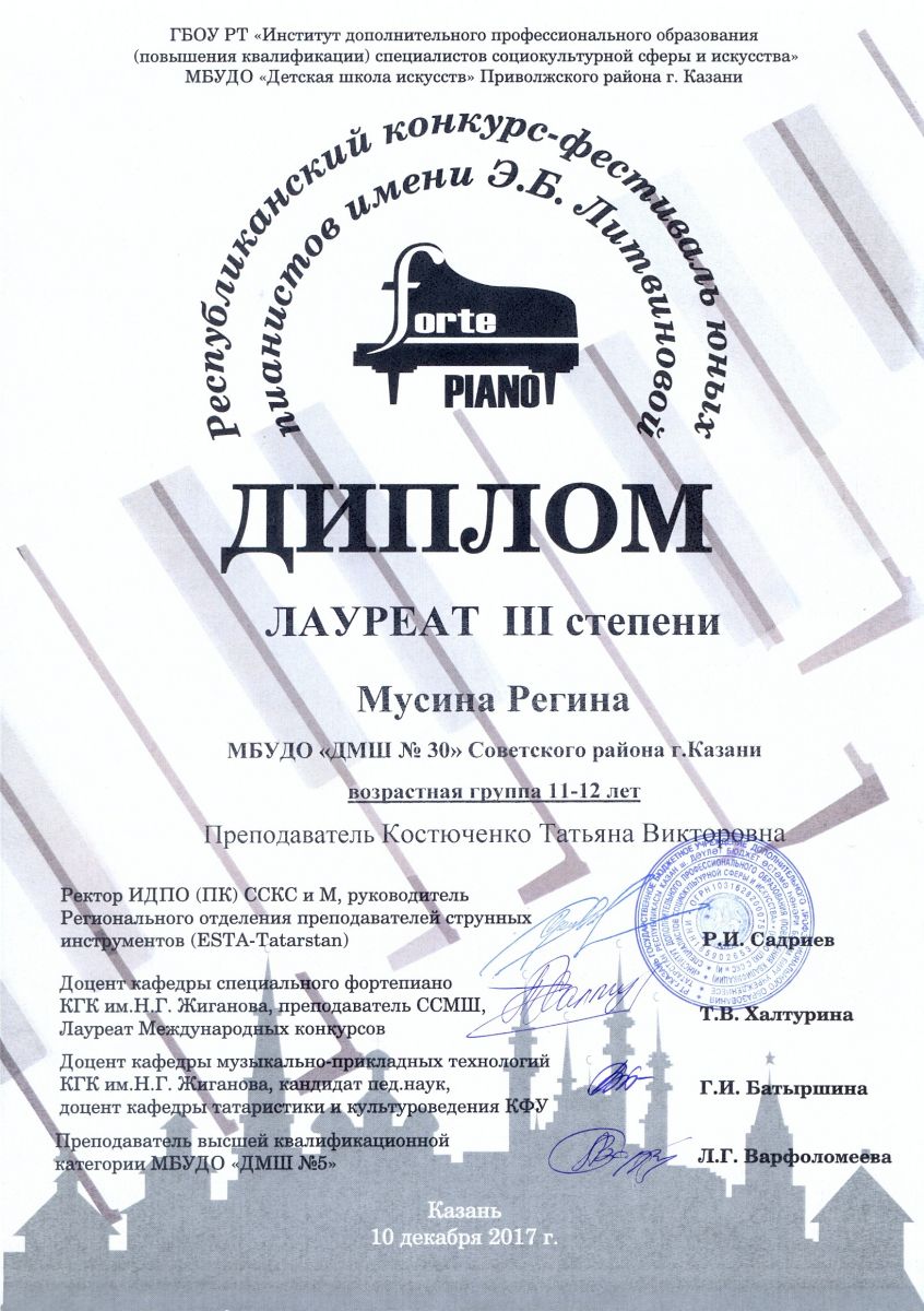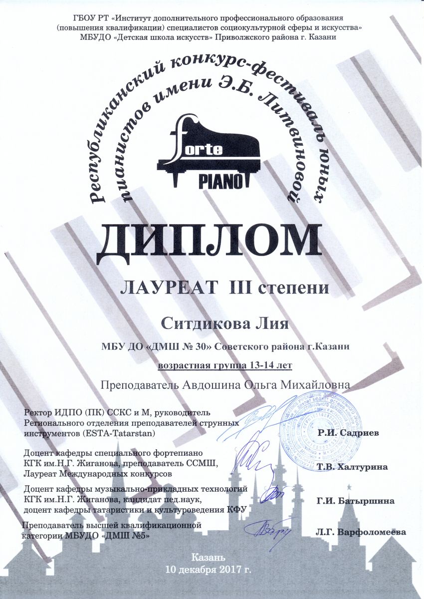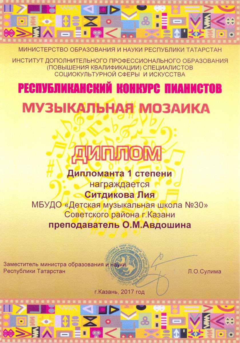 Республиканский конкурс пианистов "Музыкальная мозаика" - Ситдикова Лия - диплом I степени