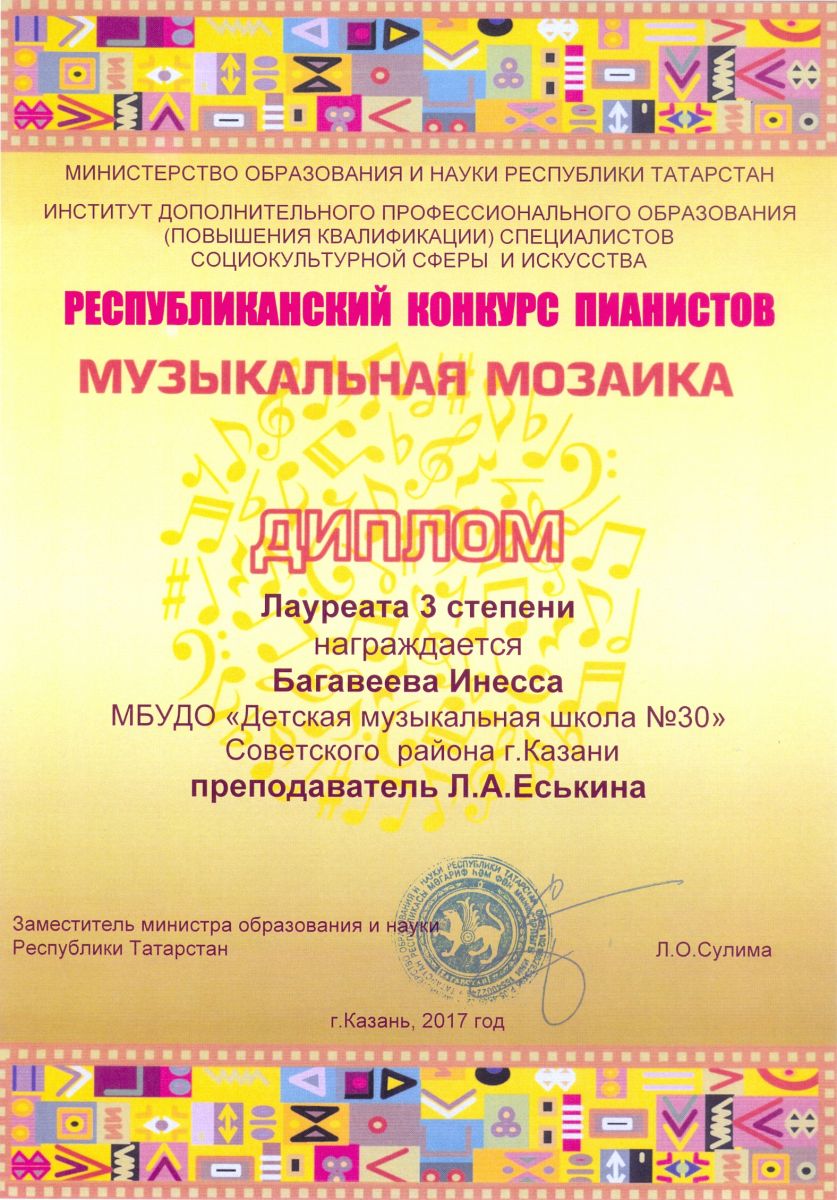 Республиканский конкурс пианистов "Музыкальная мозаика" - Багавеева Инесса - III место