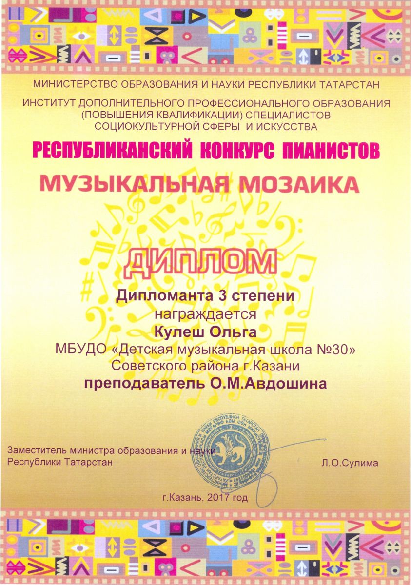 Республиканский конкурс пианистов "Музыкальная мозаика" - Кулеш Ольга - диплом III степени