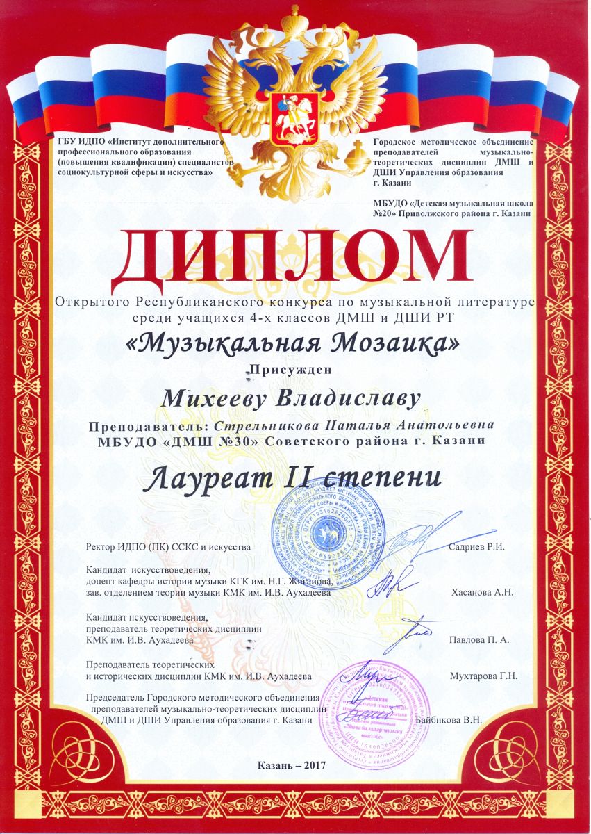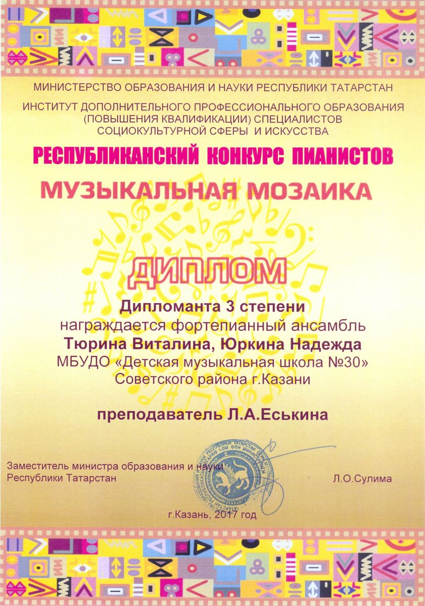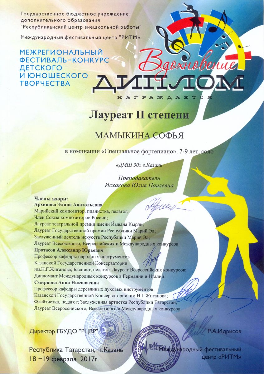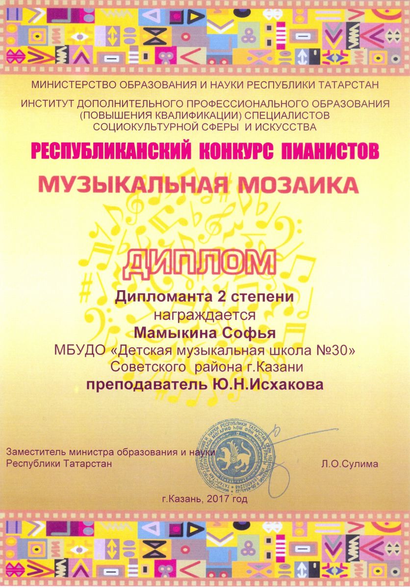 Республиканский конкурс пианистов "Музыкальная мозаика" - Мамыкина Софья - диплом II степени