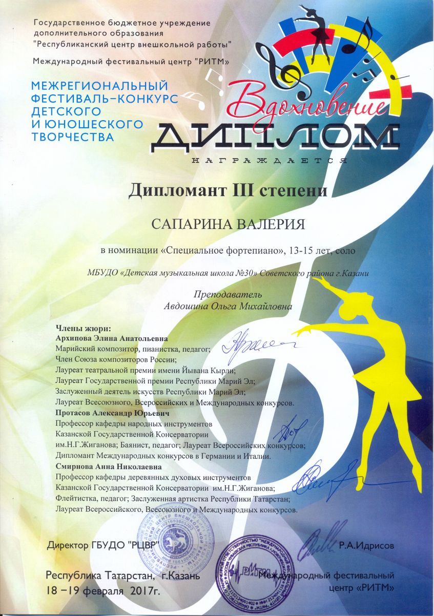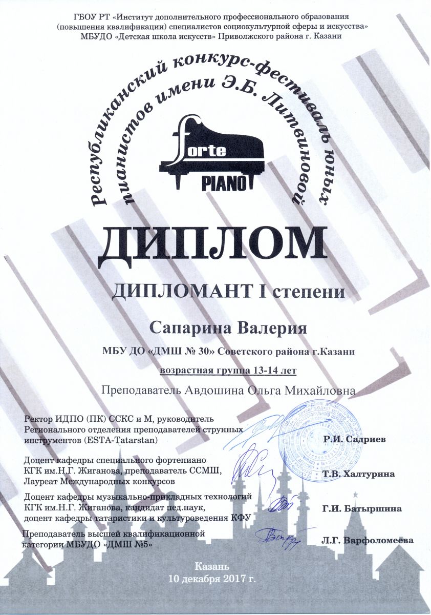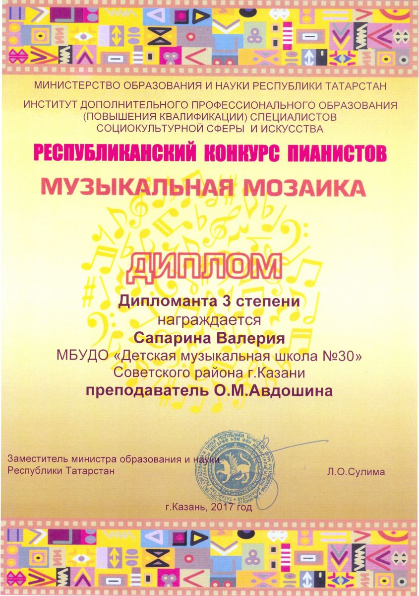 Республиканский конкурс пианистов "Музыкальная мозаика" - Сапарина Валерия - диплом III степени