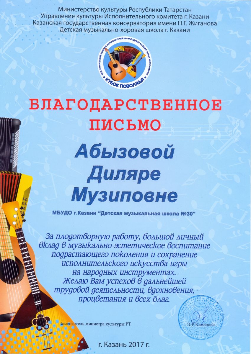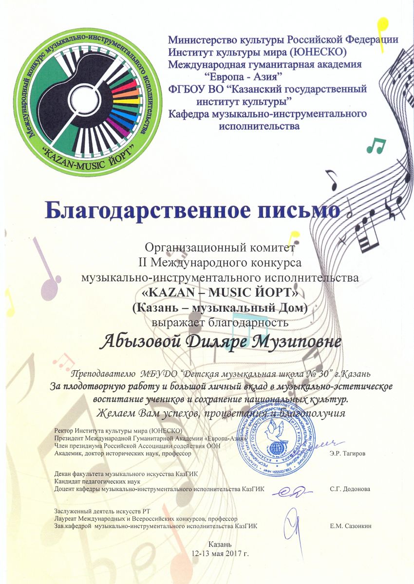 II Международный конкурс музыкально-инструментального исполнительства "KAZAN - MUSIC ЙОРТ" - Абызова Д.М. - благодарственное письмо