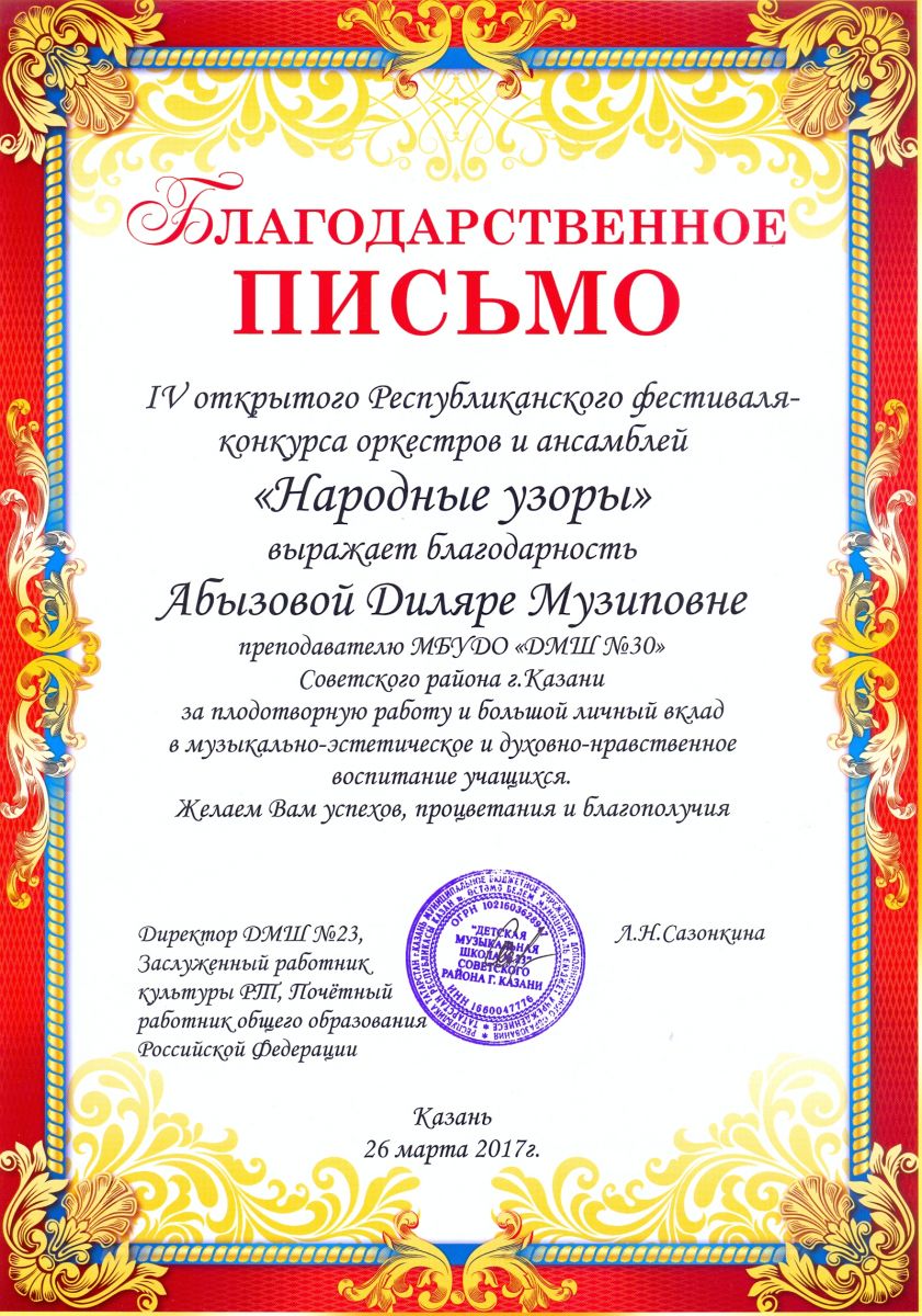 IV Открытый Республиканский фестиваль-конкурс оркестров и ансамблей "Народные узоры" - Абызова Д.М. - благодарственное письмо за личный вклад в воспитание учащихся