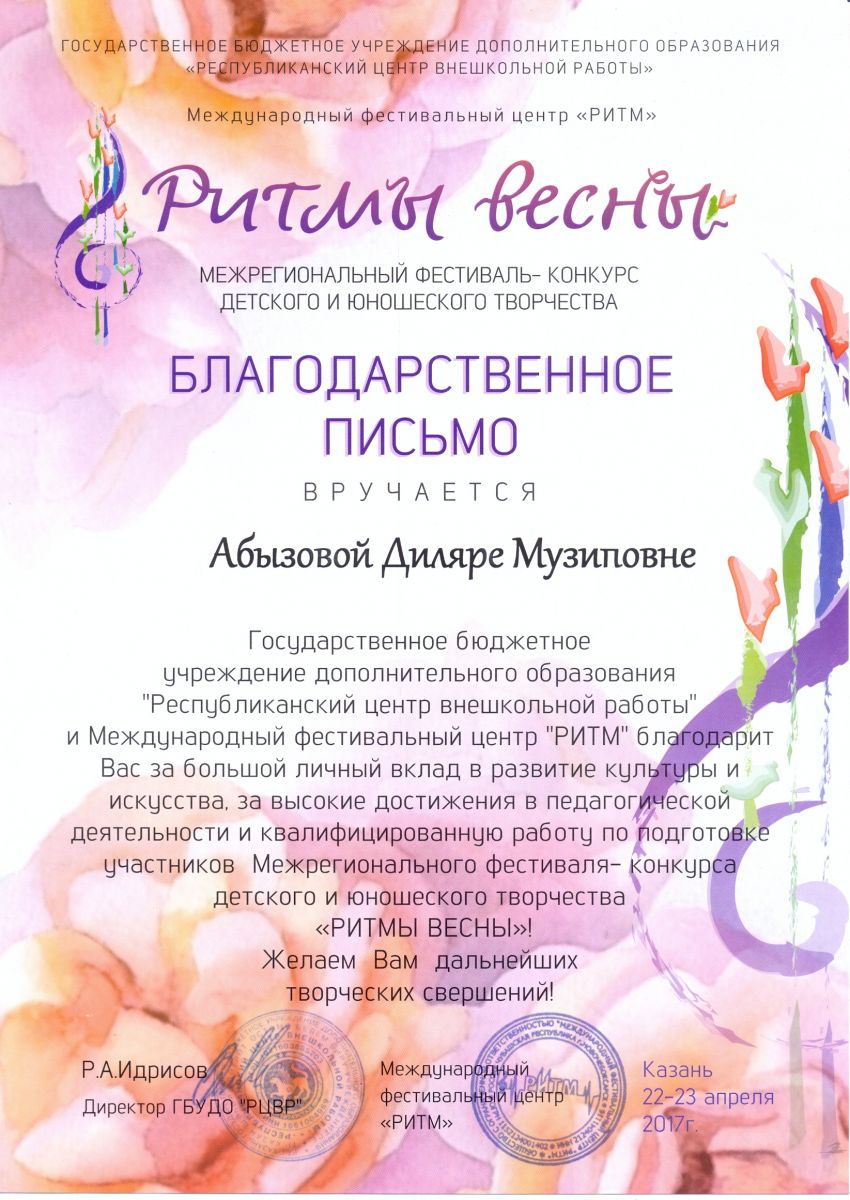 Межрегиональный фестиваль-конкурс детского и юношеского творчества "Ритмы весны" - Абызова Д.М. - благодарственное письмо