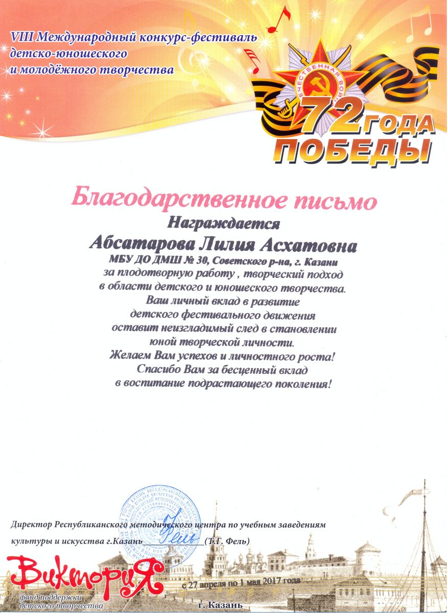 VIII Международный конкурс-фестиваль детско-юношеского и молодежного творчества "Виктория", посвященный 72-ой годовщине Победы ВОВ - Абсатарова Л.А. - благодарственное письмо за плодотворную работу, творческий подход в области детского и юношеского творчества