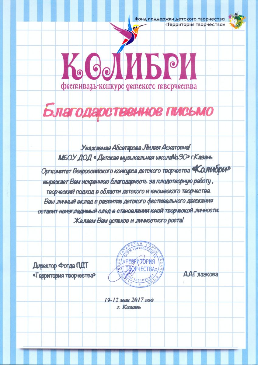 Всероссийский конкурс детского творчества "Колибри" - Абсатарова Л.А. - благодарственное письмо за плодотворную работу и творческий подход в области детского и юношеского творчества