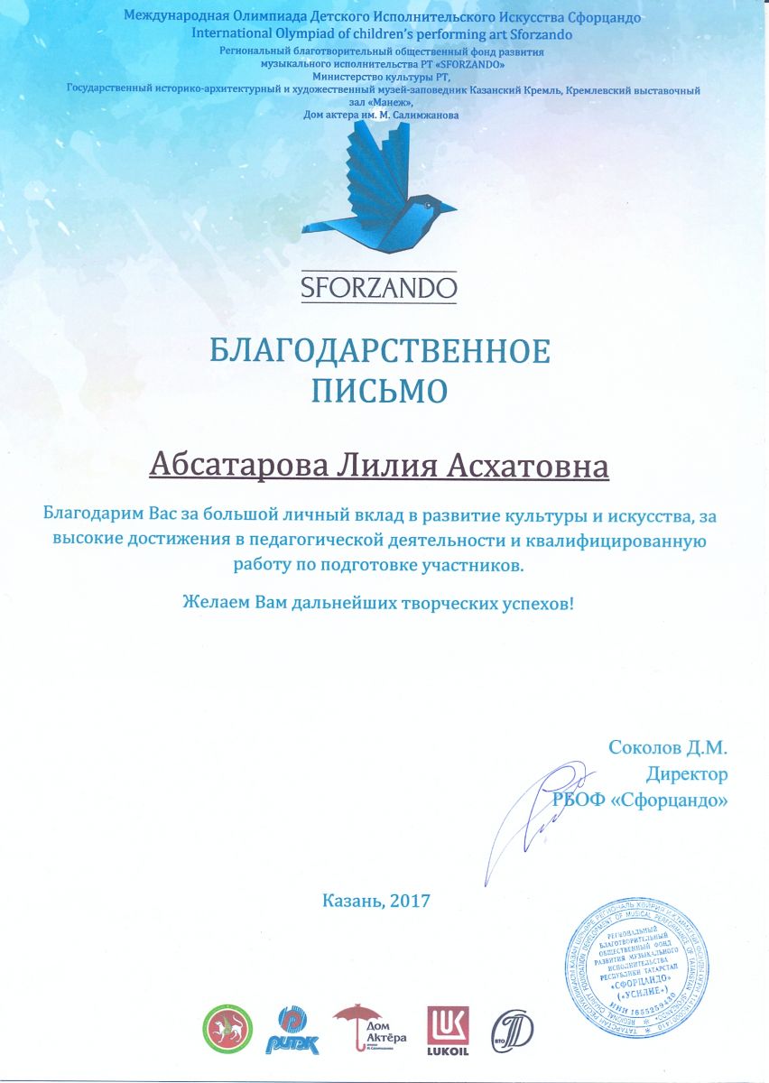 Международная олимпиада детского исполнительского искусства "SFORZANDO" - Абсатарова Л.А. - благодарственное письмо