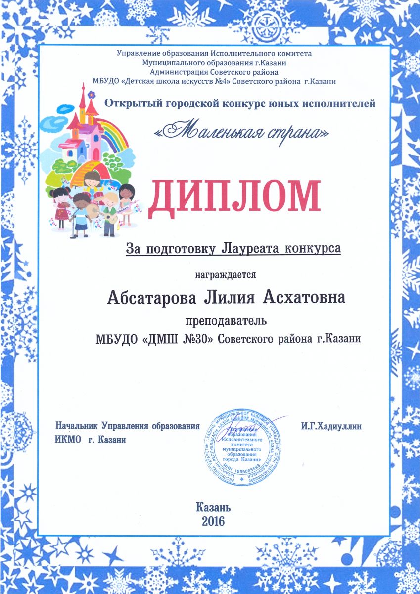 Открытый городской конкурс юных исполнителей "Маленькая страна" - Абсатарова Л.А. - диплом за подготовку Лауреата конкурса