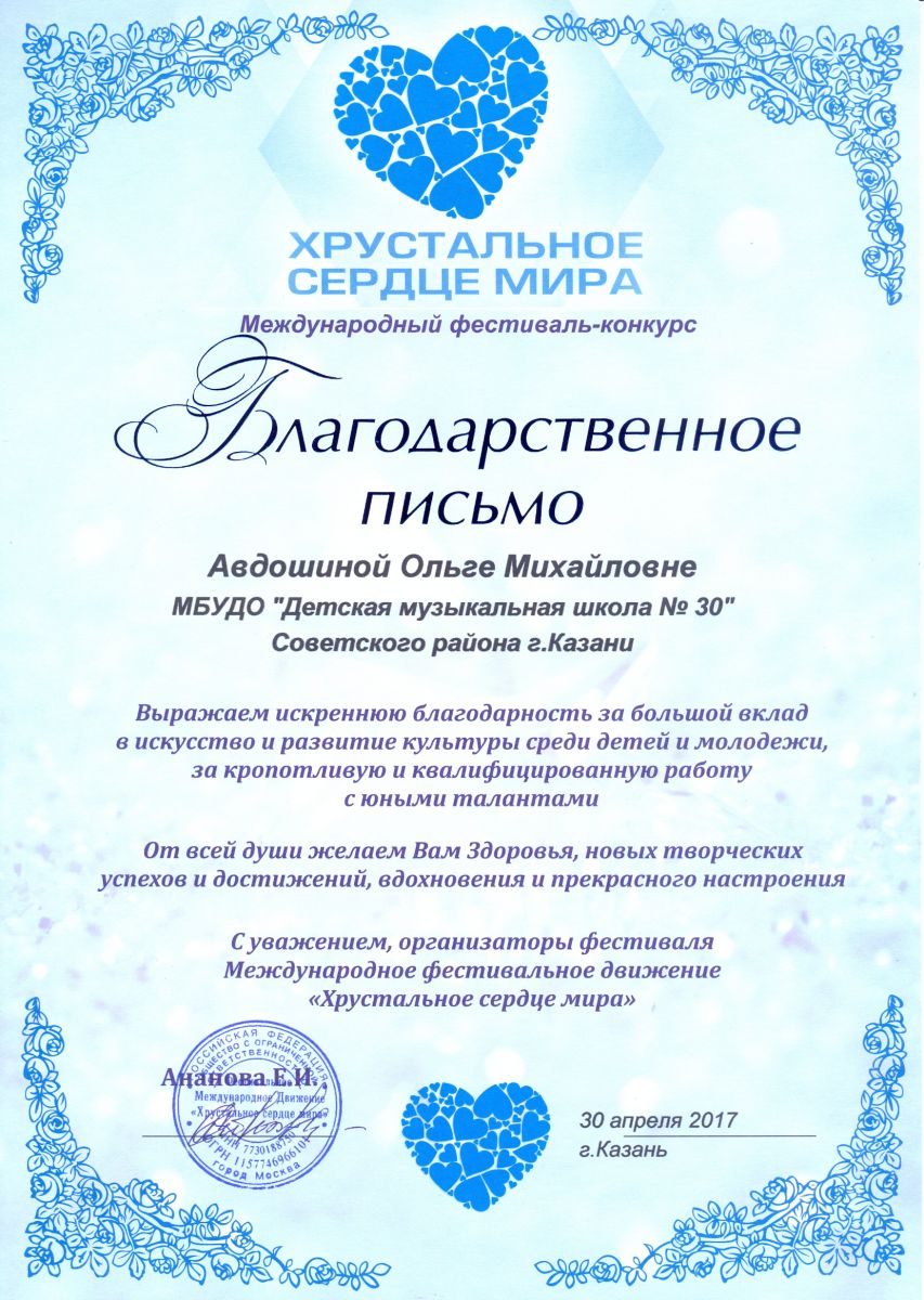 Международный фестиваль-конкурс "Хрустальное сердце мира" - Авдошина О.М. - благодарственное письмо за большой вклад в искусство и развитие культуры среди детей и молодежи