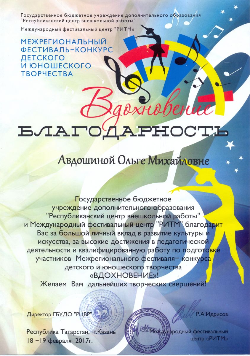 Межрегиональный фестиваль-конкурс детского и юношеского творчества "Вдохновение" - Авдошина О.М. - благодарственное письмо за высокие достижения в педагогической деятельности