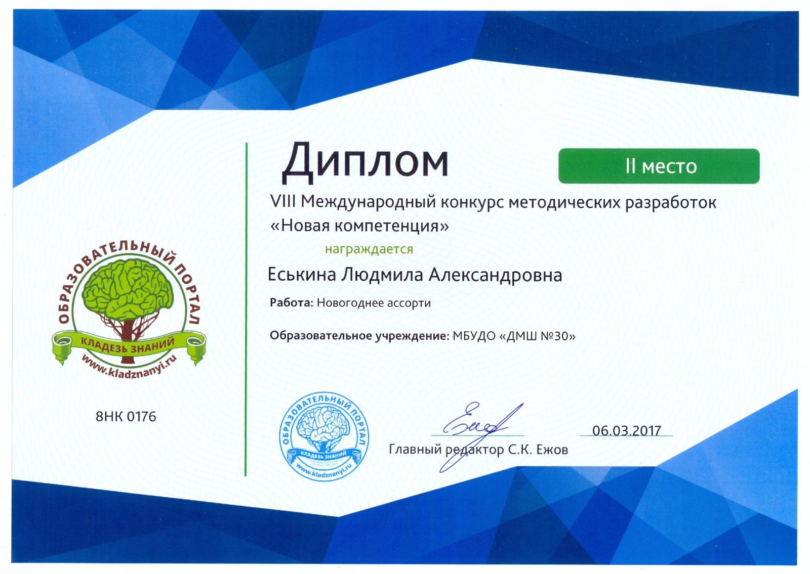 VIII Международный конкурс методических разработок "Новая компетенция" - Еськина Л.А. - II место