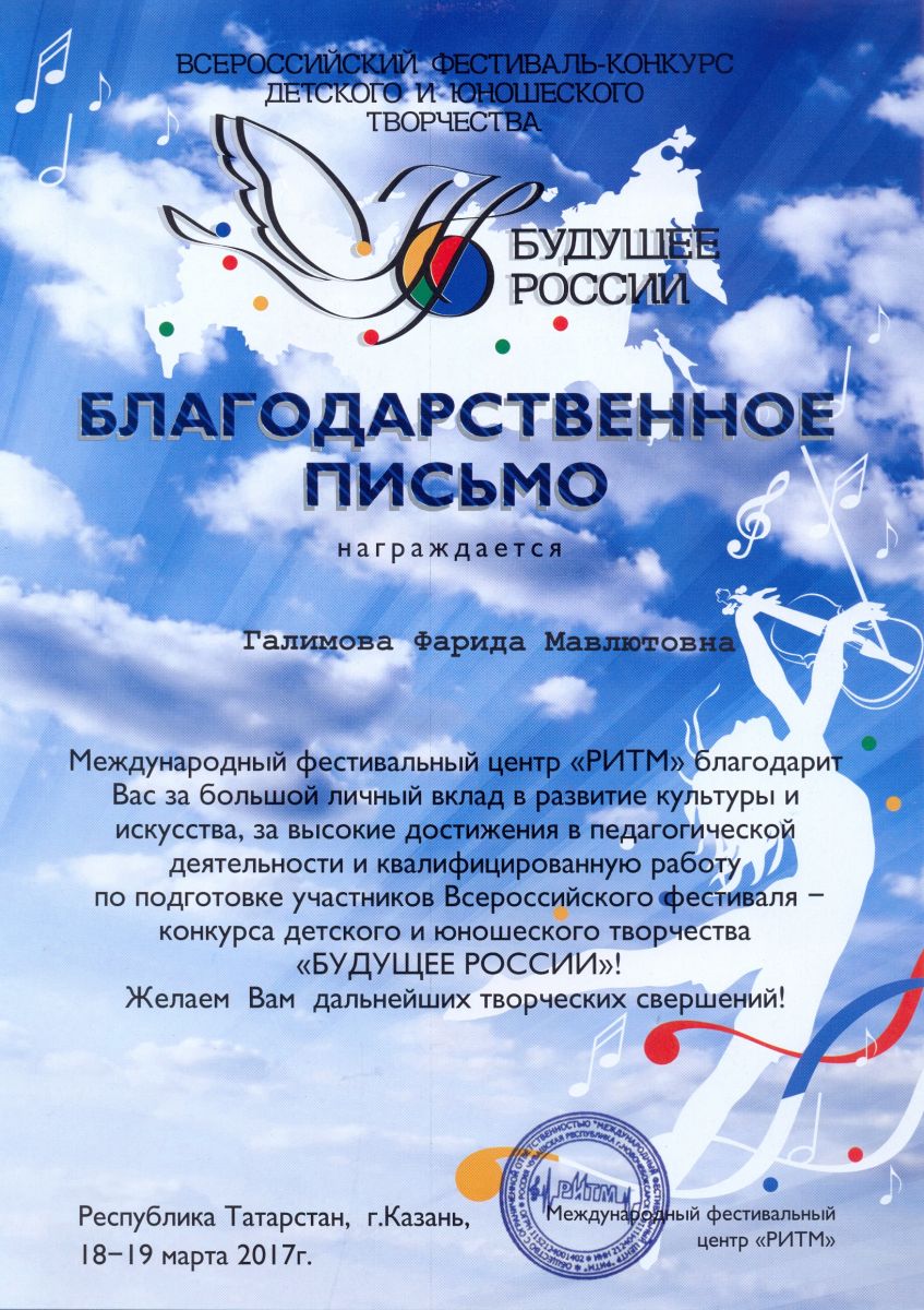 Всероссийский фестиваль-конкурс детского и юношеского творчества "Будущее России" - Галимова Ф.М. - благодарственное письмо за высокие достижения в педагогической деятельности