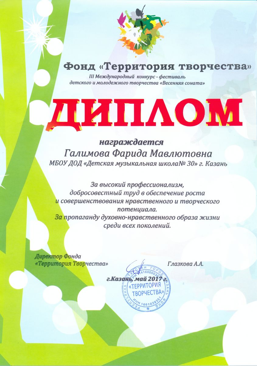 III Международный конкурс-фестиваль детского и молодежного творчества "Весеняя соната" - Галимова Ф.М. - диплом за высокий профессионализм