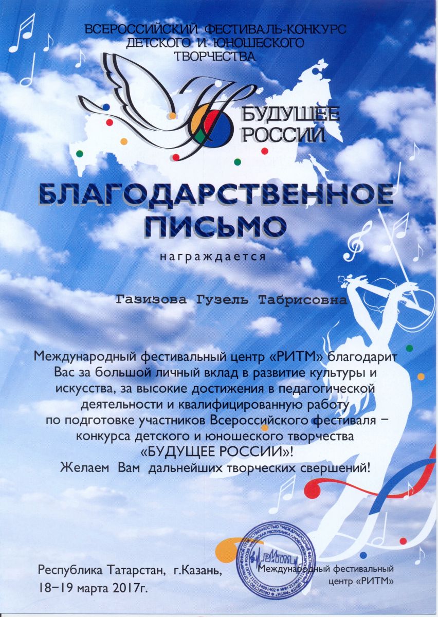 Всероссийский фестиваль-конкурс детского и юношеского творчества "Будущее России" - Газизова Г.Т. - благодарственное письмо за высокие достижения в педагогической деятельности