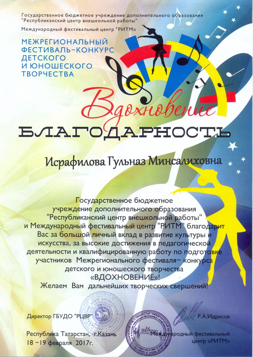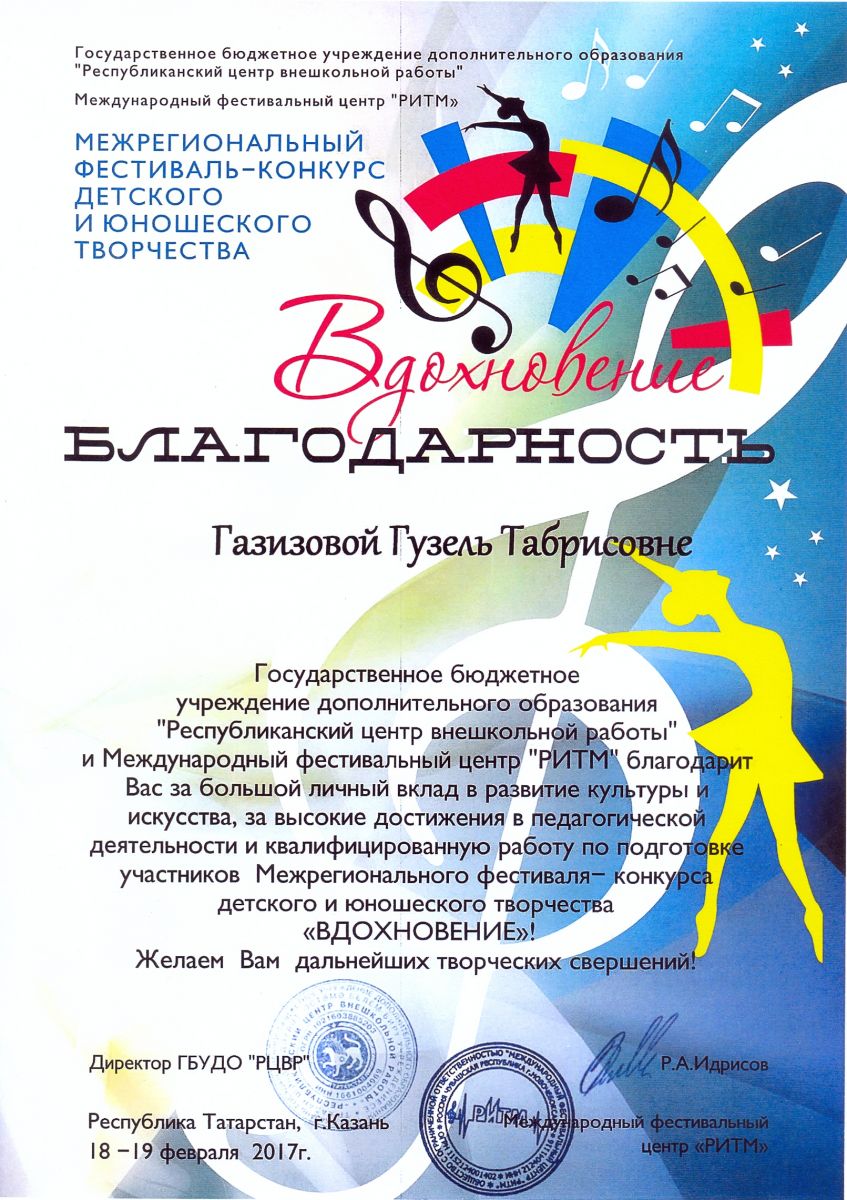 Межрегиональный фестиваль-конкурс детского и юношеского творчества "Вдохновение" - Газизова Г.Т. - благодарственное письмо за высокие достижения в педагогической деятельности