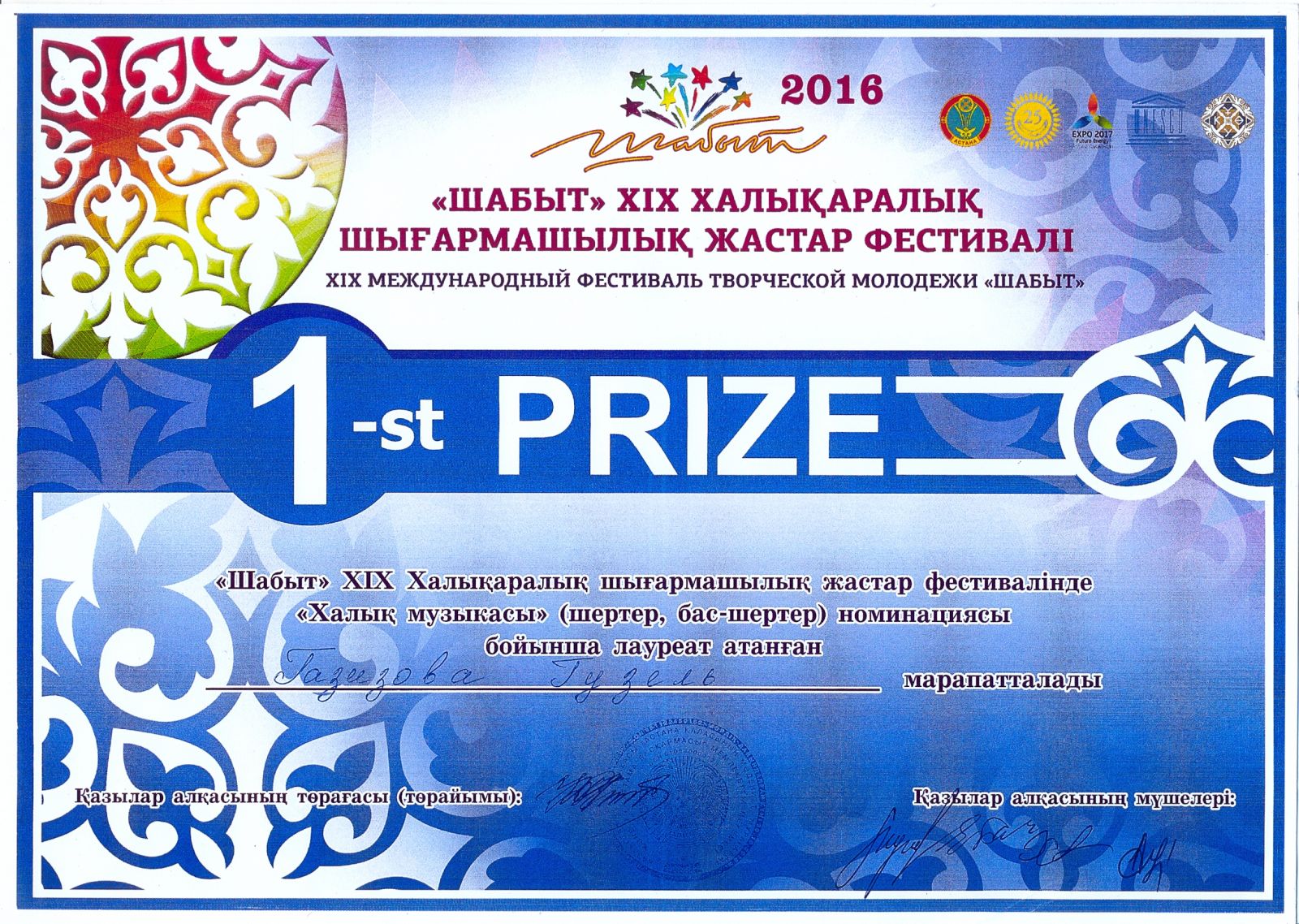 XIX Международный фестиваль творческой молодежи "Шабыт" - Газизова Г.Т. - I место