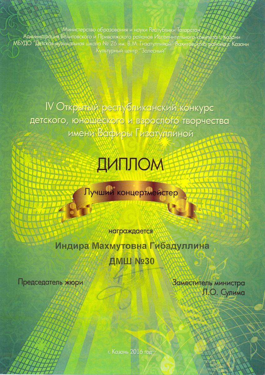IV Открытый республиканский конкурс детского, юношеского и взрослого творчества имени Вафиры Гизатуллиной - Гибадуллина И.М. - диплом Лучшего концертмейстера