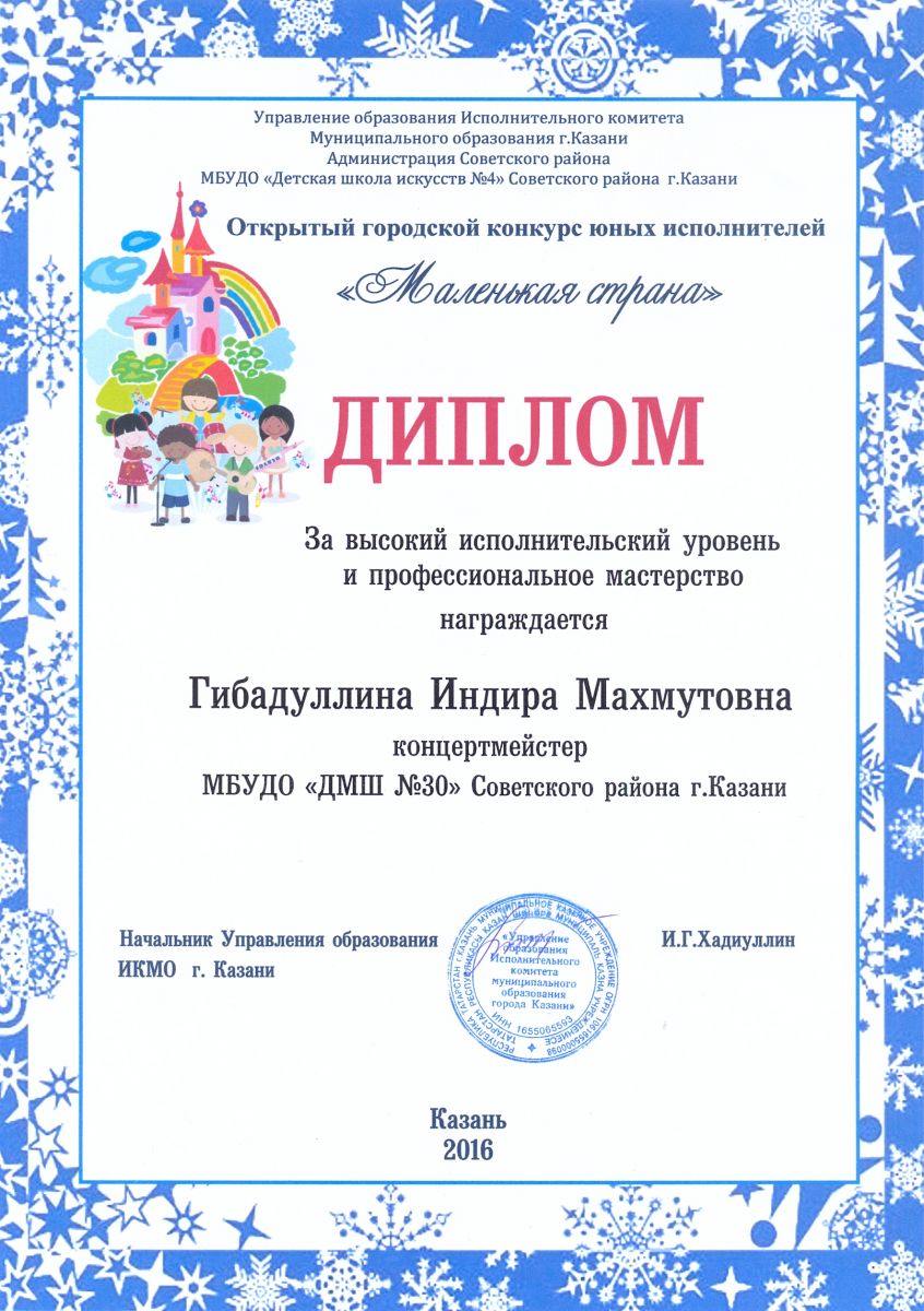 Открытый городской конкурс юных исполнителей "Маленькая страна" - Гибадуллина И.М. - диплом за высокий исполнительский уровень и профессиональное мастерство