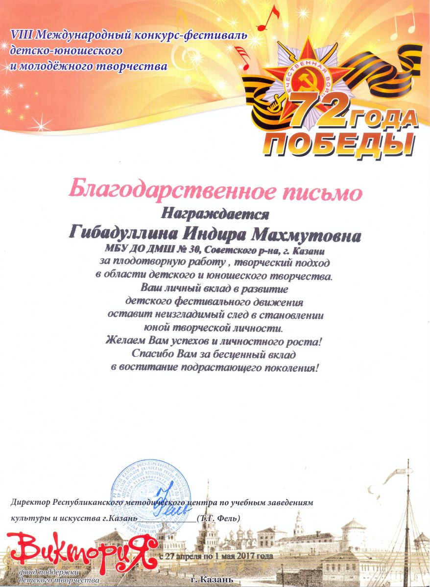 VIII Международный конкурс-фестиваль детско-юношеского и молодежного творчества "Виктория", посвященный 72-ой годовщине Победы ВОВ - Гибадуллина И.М. - благодарственное письмо за плодотворную работу, творческий подход в области детского и юношеского творчества