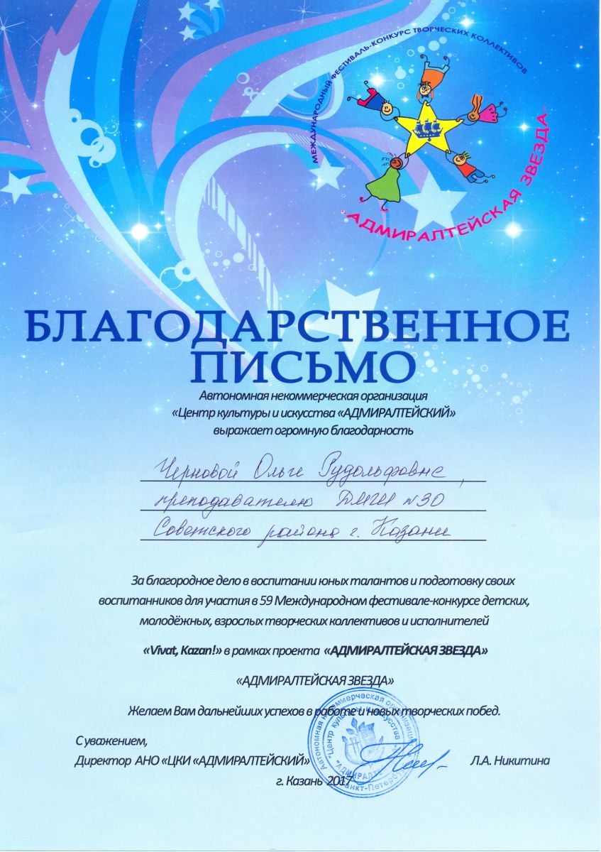 59 Международный фестиваль-конкурс детских, молодёжных, взрослых  творческих коллективов и исполнителей "Vivat, Kazan!" в рамках проекта "Адмиралтейская звезда" - Чернова О.Р. - благодарственное письмо
