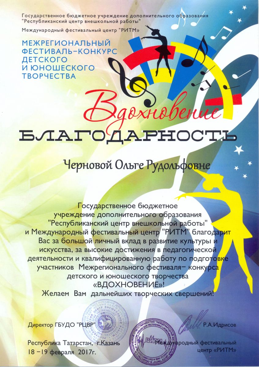 Межрегиональный фестиваль-конкурс детского и юношеского творчества "Вдохновение" - Чернова О.Р. - благодарственное письмо за высокие достижения в педагогической деятельности