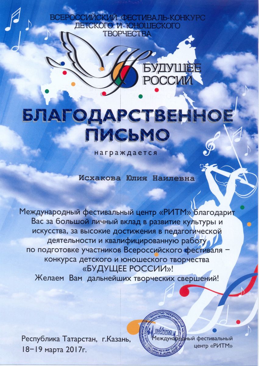 Всероссийский фестиваль-конкурс детского и юношеского творчества "Будущее России" - Исхакова Ю.Н. - благодарственное письмо за высокие достижения в педагогической деятельности